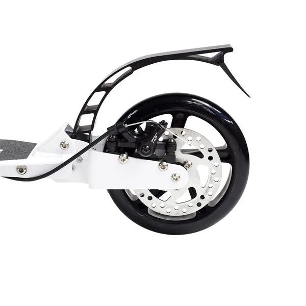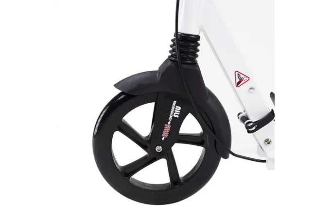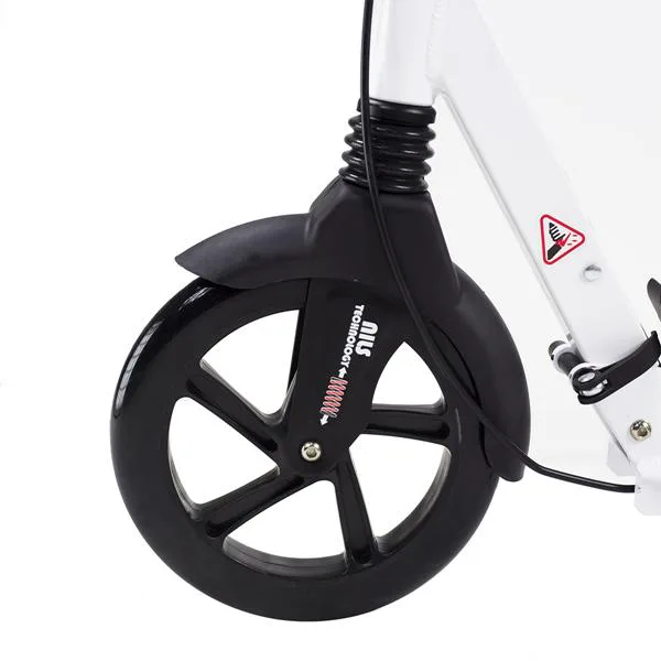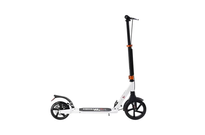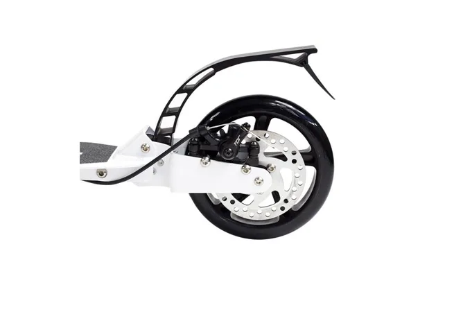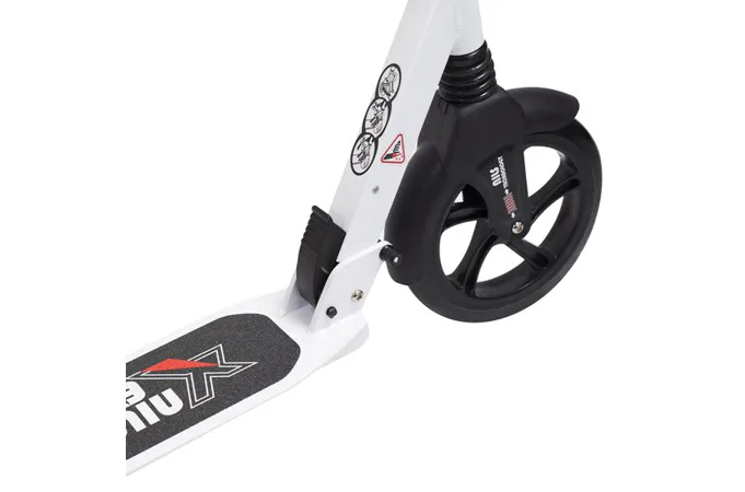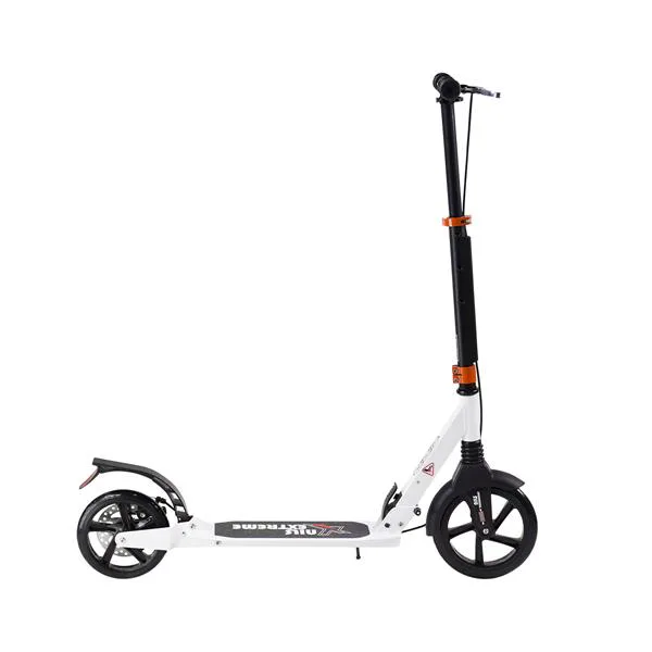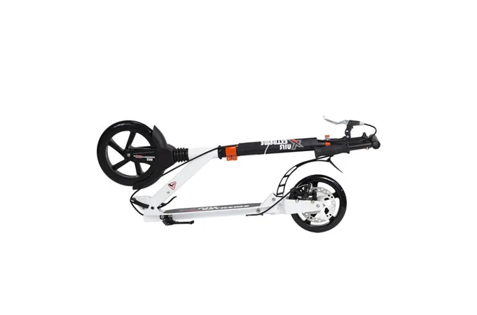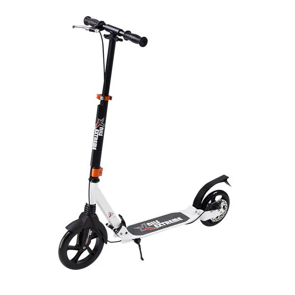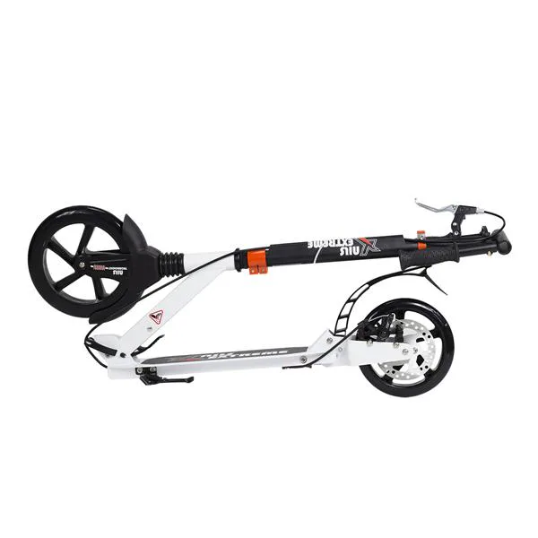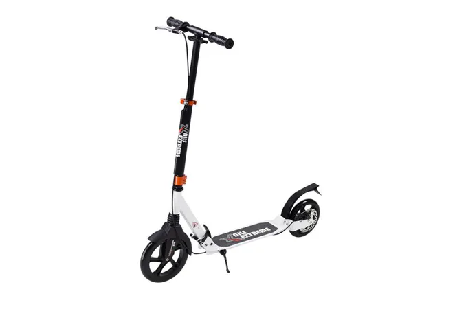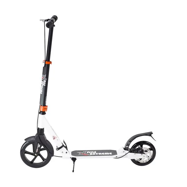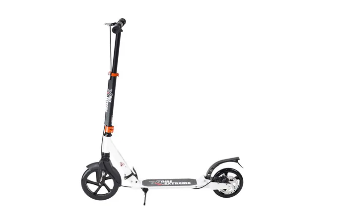 Skladacia kolobežka značky NILS EXTREME HA230T je kolobežka určená pre celú rodinu. Charakteristickou vlastnosťou kolobežky sú dva tlmiče – predný zvislý a zadný vodorovný, zaisťujúci väčší komfort počas jazdy, minimalizujú drncanie a pohlcujú otrasy. Vďaka tomu sa produkt dobre osvedčí pri prechádzaní nerovných povrchov. Široký a dlhý nášľap je pokrytý protišmykovým gripom zaisťujúcim správnu priľnavosť topánky. Nastaviteľné riadidlá (až do výšky 106 cm) umožňujú prispôsobiť kolobežku k výške dieťaťa alebo tiež zaisťujú pohodlnú jazdu dospelým osobám. Okrem toho má kolobežka 2 rozdielne veľkosti koliesok a to predné 230 mm a zadné 200 mm. Novo je tento model vybavený aj kotúčovou brzdou.