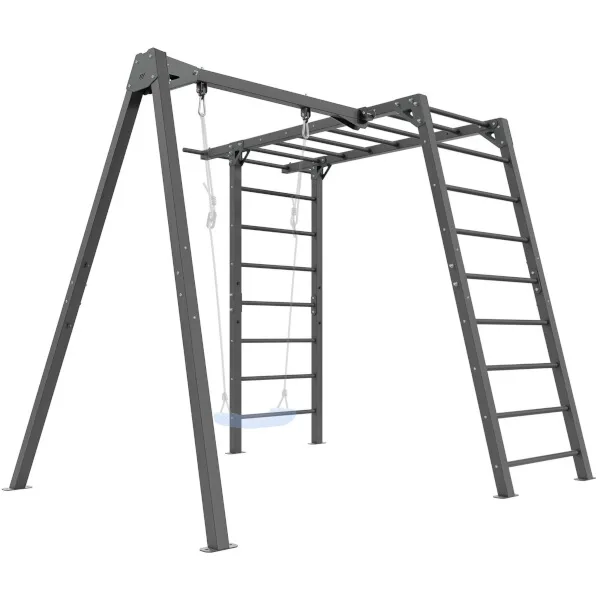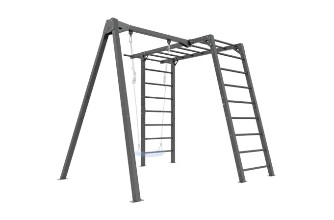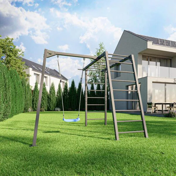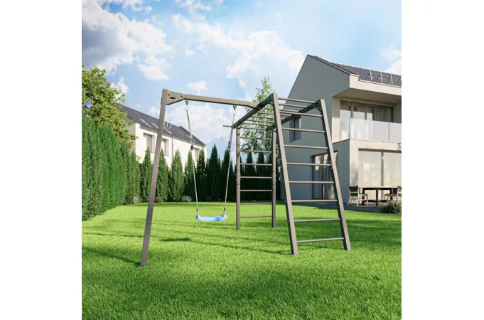 Funkčná záhradná zostava od MARBO Sport MO-Z6 skladajúca sa z konštrukcie pre 1 hojdačku a gymnastických rebrín, ktoré deti využijú aj ako preliezačku. Zostava je ideálna pre tréning, alebo rodinnú zábavu v súkromí vlastnej záhrady.