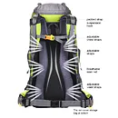 Pohodlné usadenie na chrbte sprostredkujú anatomicky tvarované ramenné a bedrové popruhy s polstrovanými dištančnými panelmi zo sieťoviny. Priedušné panely v bedrovej časti a na lopatkách znižujú priľnavosť k chrbtu a prispievajú k lepšiemu vetraniu chrbta.