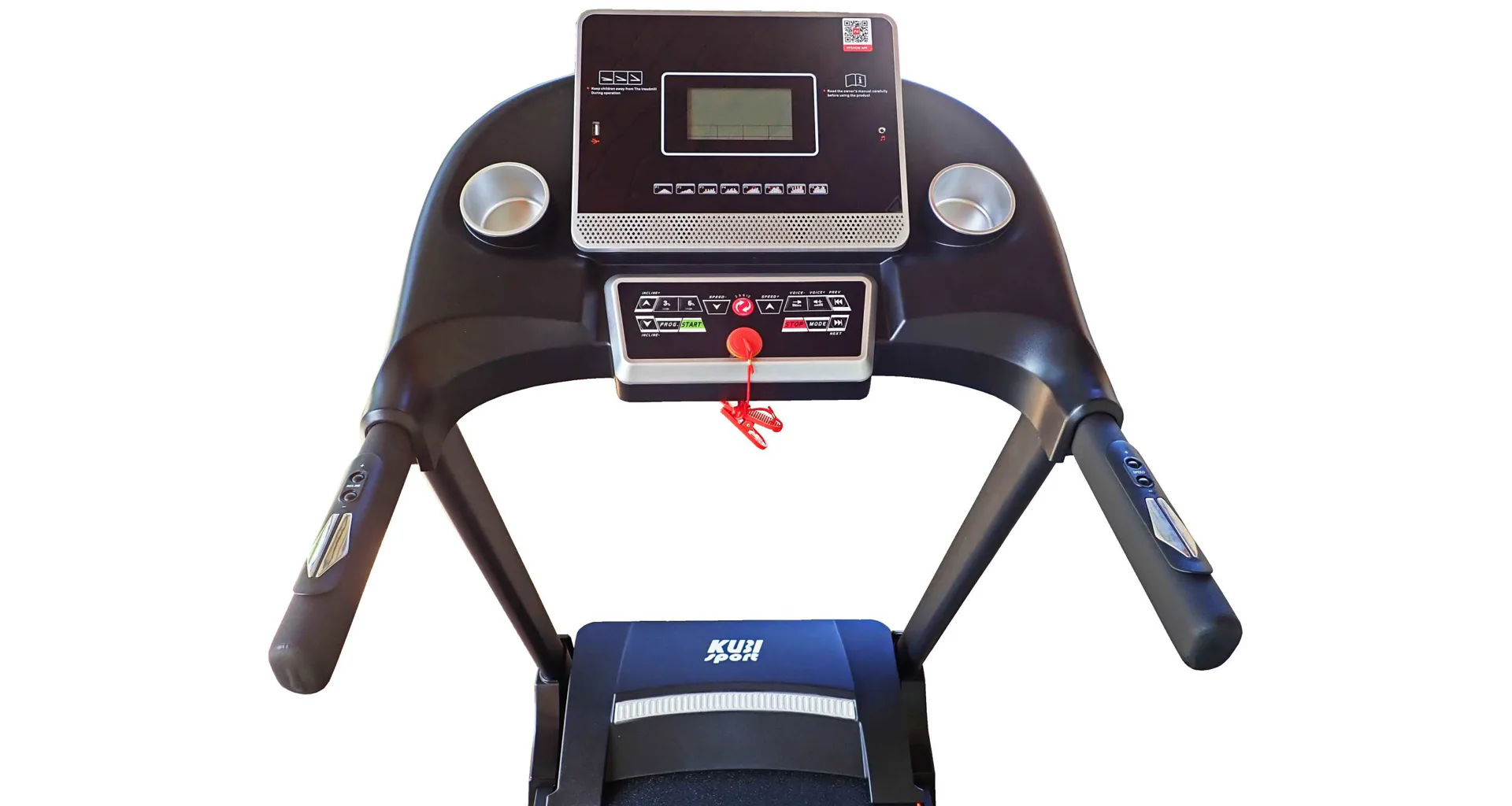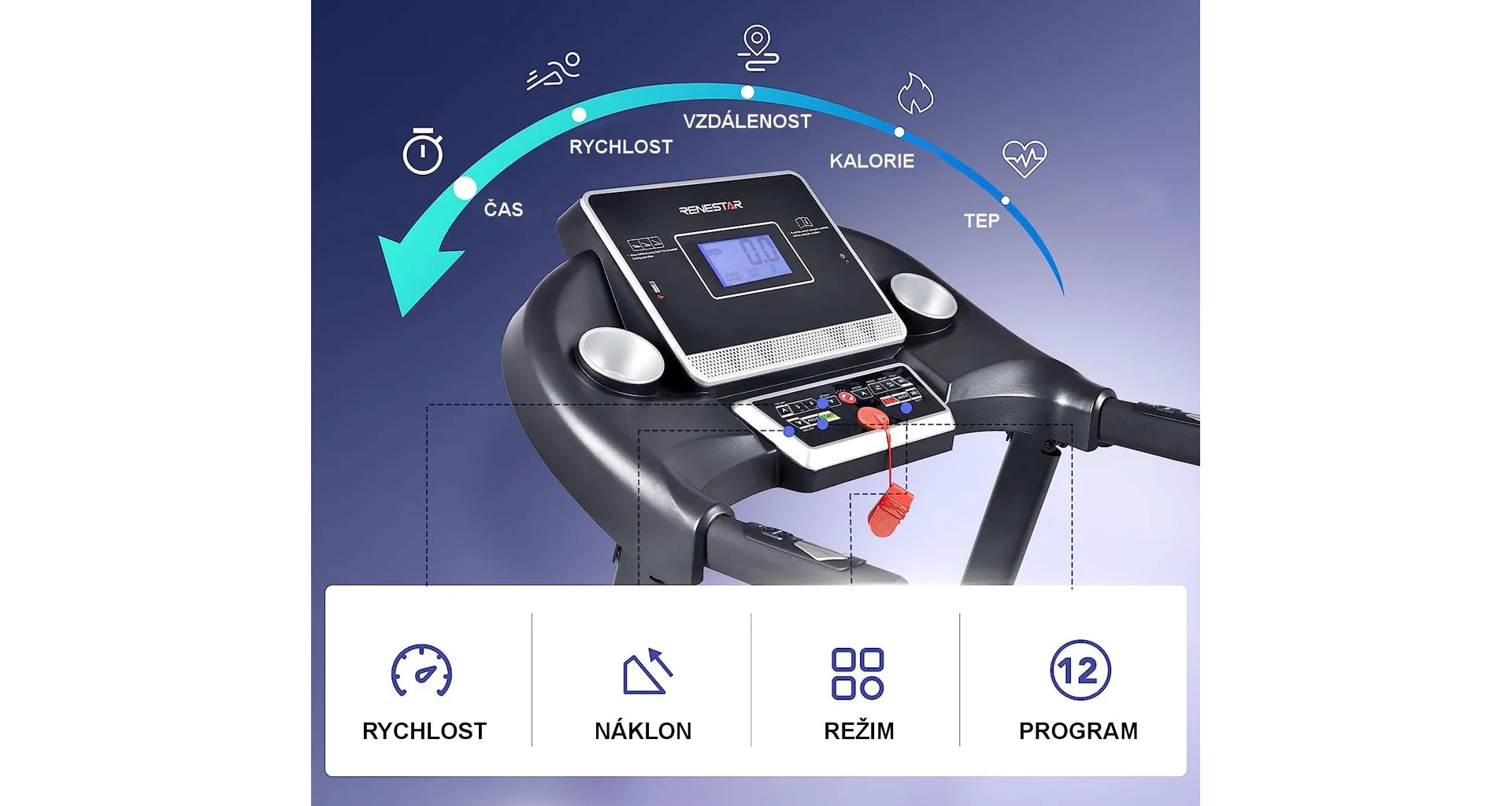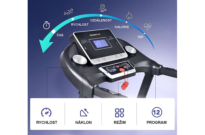 LED displej zobrazuje důležité informace jako čas, spálené kalorie, rychlost, vzdálenost, tepovou frekvenci, úhel náklonu apod... Zároveň je možné pás připojit k oblíbené běžecké aplikaci Kinomap, Zwift nebo FitShow. (aplikace je ke stažení na Google Play a App Store).