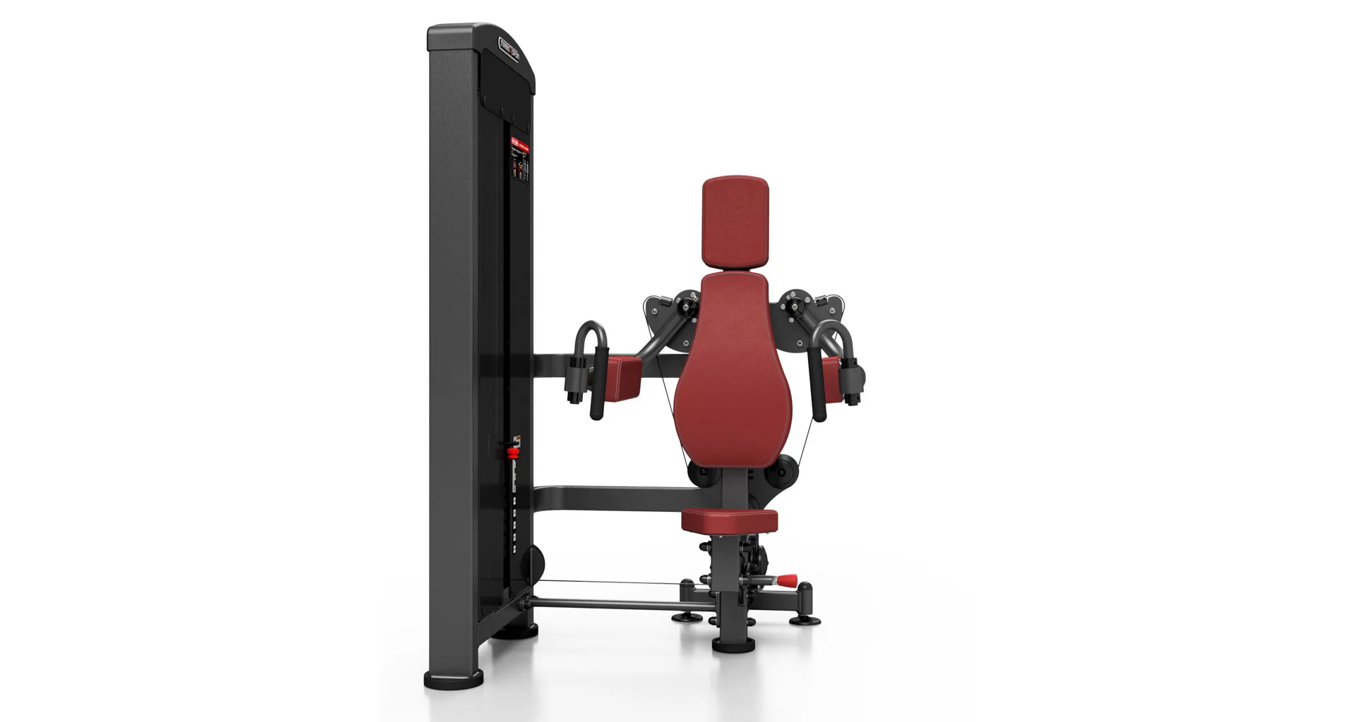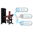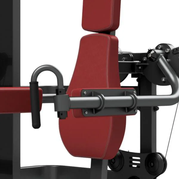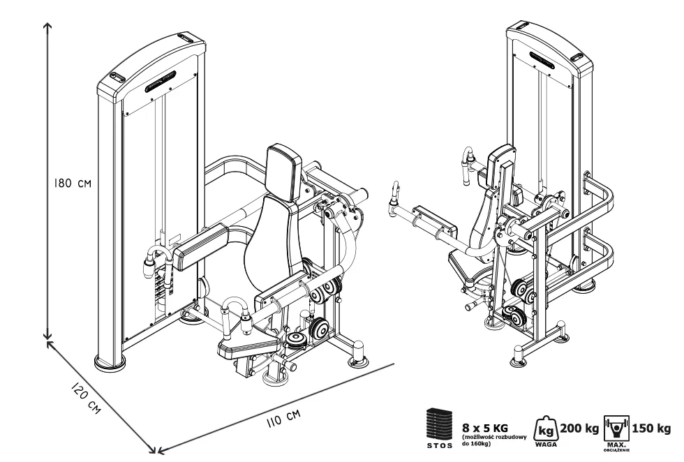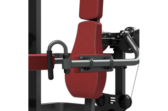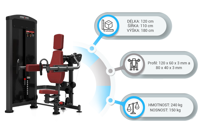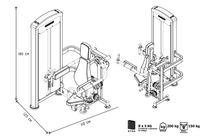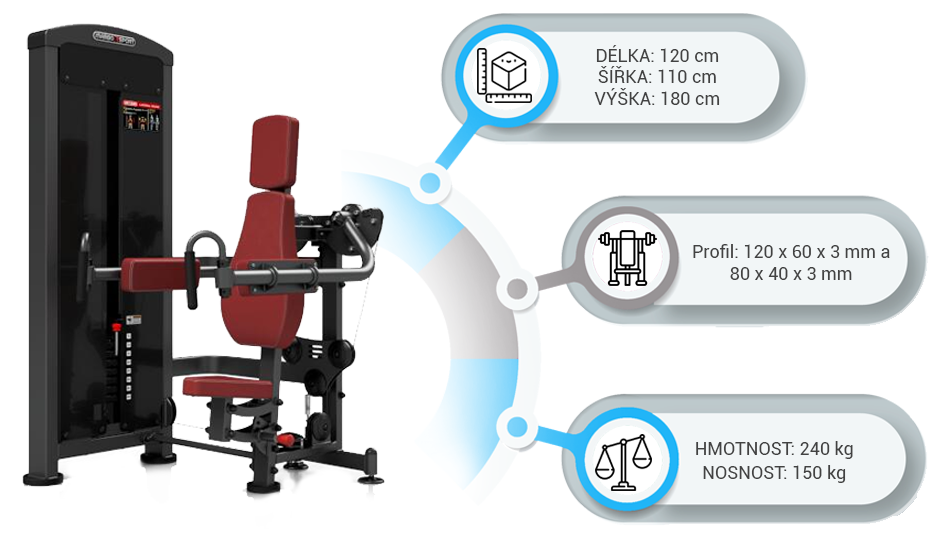 Záťaž tvorí 8ks 5 kg tehál. Celková váha závažia dodávaná so strojom je teda 40 kg s možnosťou rozšírenia až do 160 kg. Ramená majú na sebe nezávislý chod. To zaručuje vysokú efektivitu tréningu. Všetky nastavenia sa vykonávajú červenými, pružinovými kolíkmi. Sedadlo má štyri polohy. Polstrovanie je zo syntetickej kože zošitej režnou niťou značky COATS vyplnené tvrdou penou, to celé je na 3 mm hrubej, oceľovej doske.