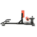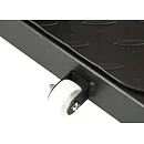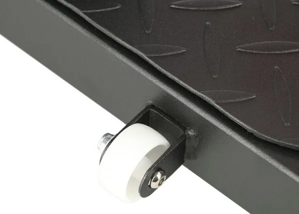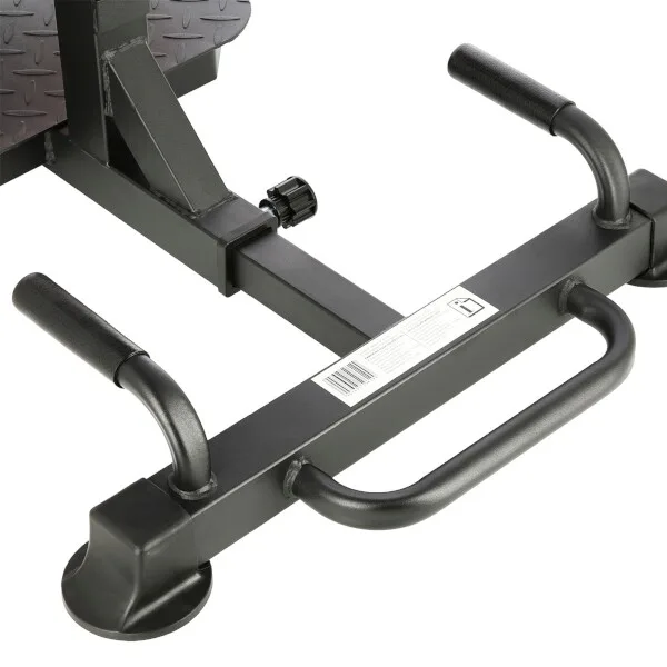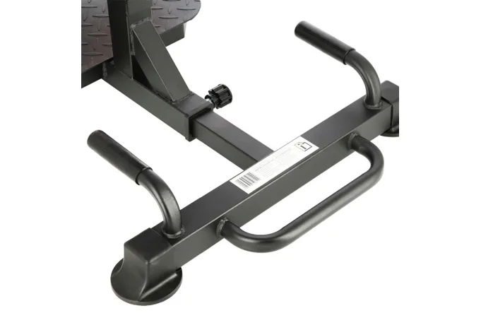 Robustná oceľová konštrukcia stojí na plastových koncovkách, ktoré chránia podlahu pred poškodením a zároveň zaisťujú vysokú stabilitu lavice. Predný stabilizátor je osadený transportnými kolieskami, zatiaľ čo zadný stabilizátor je opatrený uchom pre ľahké presunutie lavice, pokiaľ ju práve nepoužívate. Zadná časť rámu sa dá zasunúť, aby lavica zaberala naozaj minimum miesta. Platforma je vyrobená z drážkovaného plechu, ktorý zamedzuje kĺzaniu topánok. Na polstrovanie je použitá hrubá doska, s vysokou vrstvou PU peny pre maximálny komfort, PU pena je tiež použitá na zarážky nôh.