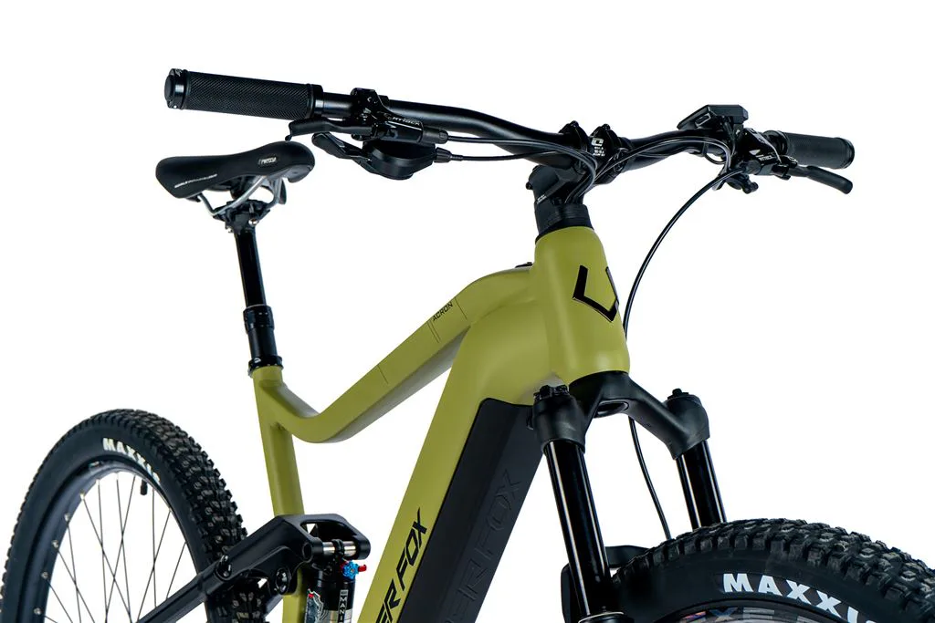 Leader Fox ACRON je horské celoodpružené elektrokolo vhodné nejen pro pány. ACRON je e-bike s plně integrovanou baterií v rámu kola, sportovním designem, odpruženou přední vidlicí a zadním tlumičem. Kapacita baterie je 23,2 Ah (835 Wh).