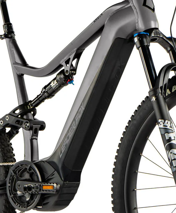 Leader Fox ARGUS je horské celoodpružené elektrokolo vhodné nejen pro pány. ARGUS je e-bike s plně integrovanou baterií v rámu kola, sportovním designem, odpruženou přední vidlicí a zadním tlumičem. Kapacita baterie je 23,2 Ah (835 Wh).