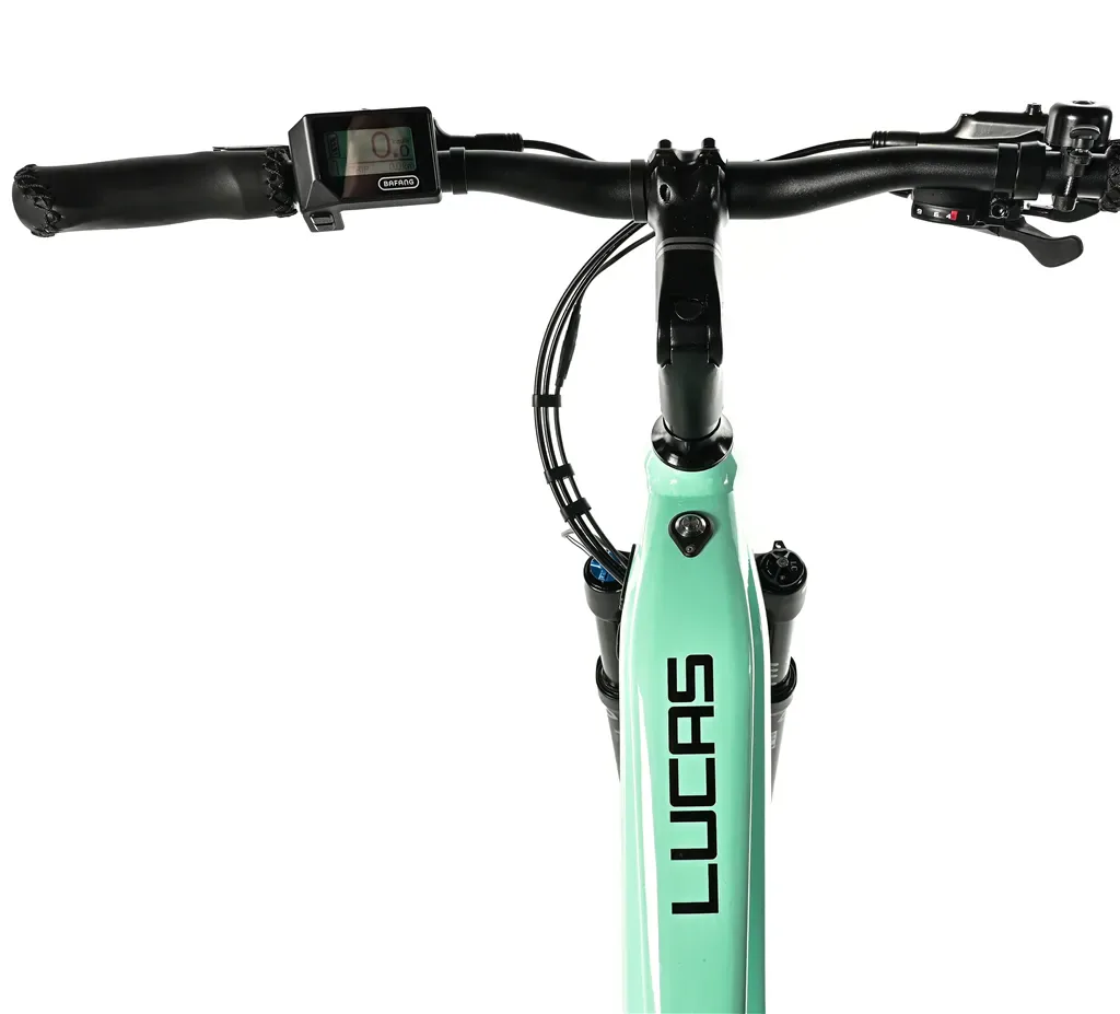 LUCAS je e-bike s plně integrovanou baterií v rámu kola, sportovním designem, odpruženou přední vidlicí, pohodlným sedlem a nosičem. Kapacita baterie je 20 Ah (720 Wh).