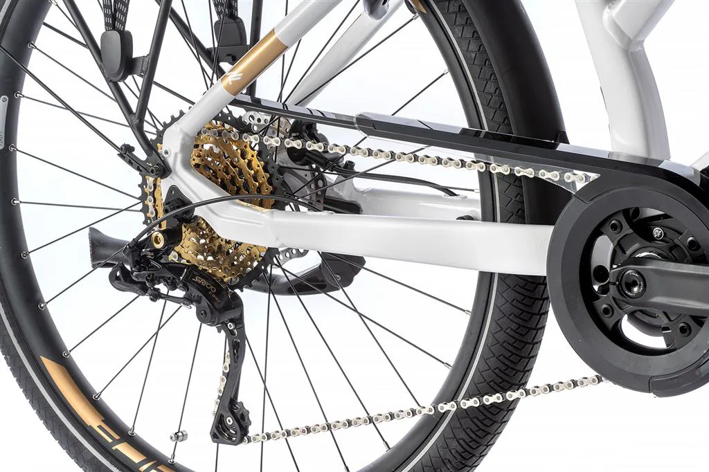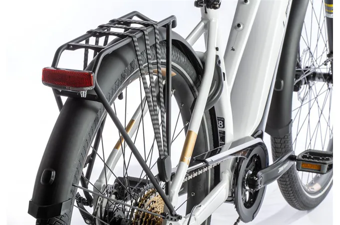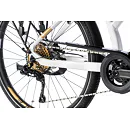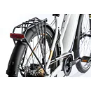 Komfort e-biku zajišťuje bohatá základní výbava s odpruženou vidlicí, kotoučovými brzdami a stabilními 28“ zapletenými koly.