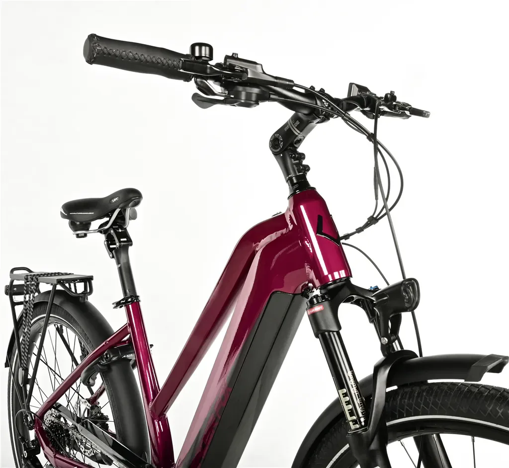 LUCAS je e-bike s plně integrovanou baterií v rámu kola, sportovním designem, odpruženou přední vidlicí, pohodlným sedlem a nosičem. Kapacita baterie je 20 Ah (720 Wh).