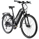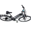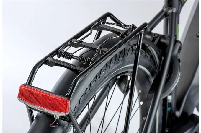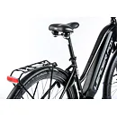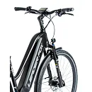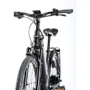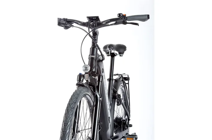 Komfort e-biku zajišťuje bohatá základní výbava s odpruženou vidlicí, kotoučovými brzdami a stabilními 28“ zapletenými koly.