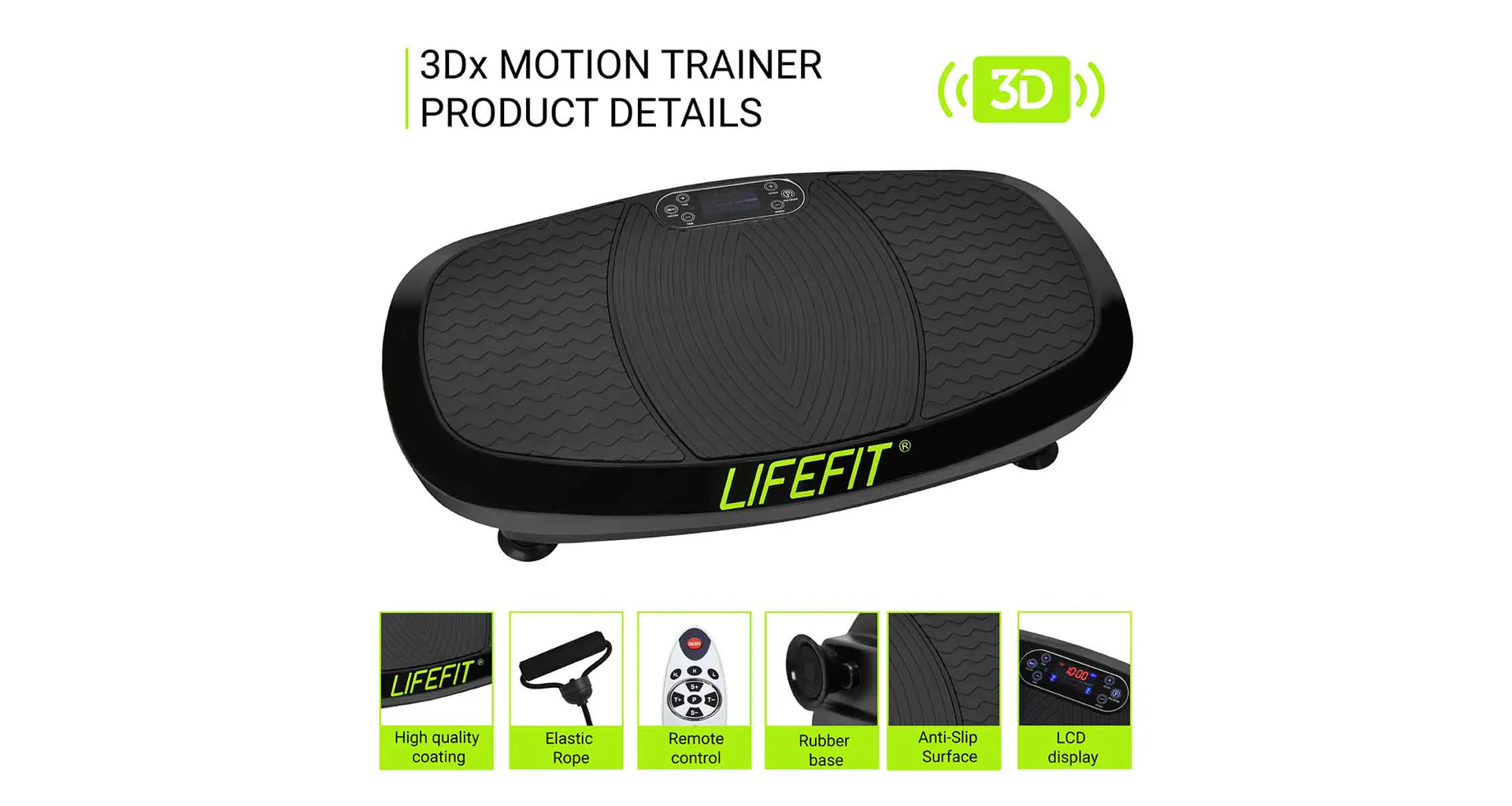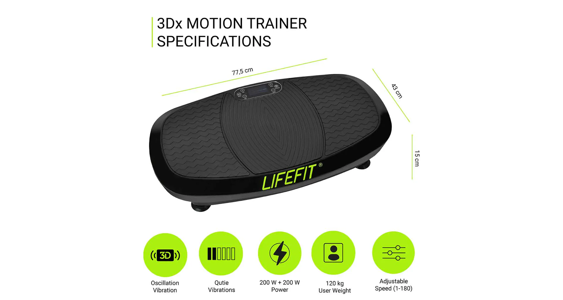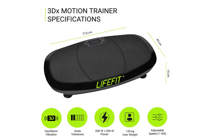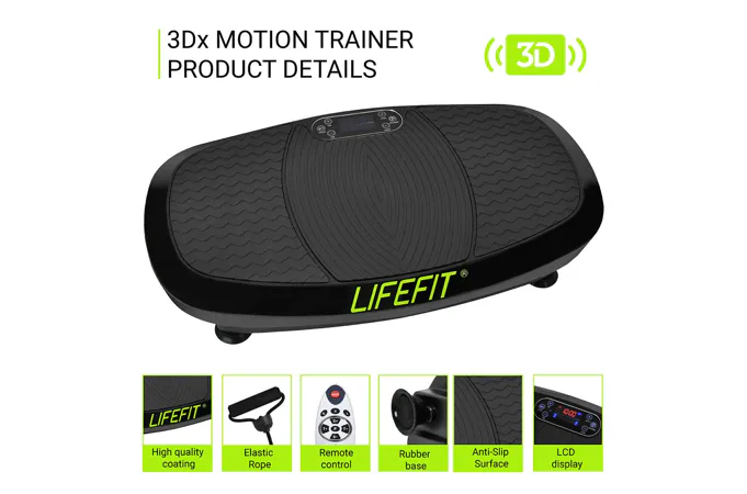 LIFEFIT 3Dx MOTION TRAINER je vibračná platforma, ktorá sa radí do vyššej triedy vibračných dosiek. Vyniká najmä svojim vysoko kvalitným spracovaním, moderným dizajnom a predovšetkým svojimi pozitívnymi účinkami pri boji s prebytočnými tukmi a celulitídou.