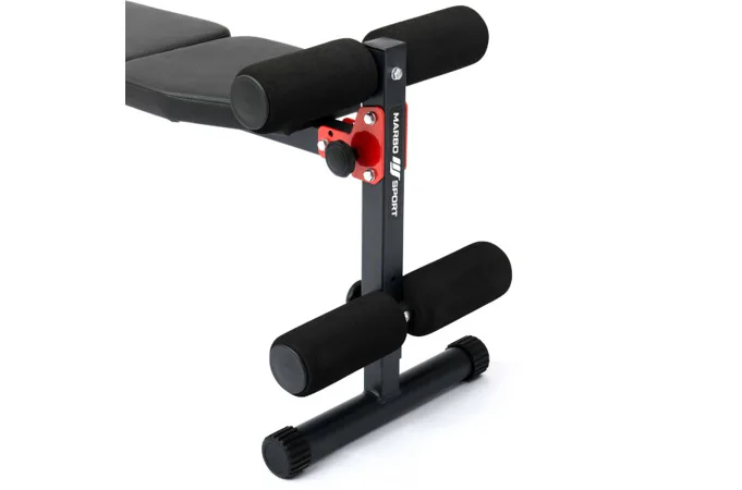 Praktickou stránkou lavice MARBO MH-L104 2.0 je možnosť rýchleho zloženia napríklad pod posteľ. Skladanie sa vykonáva pomocou skrutiek s plastovým, ergonomickým úchytom. Na zarážky sa navliekajú 8 centimetrov vysokej valce z EVA peny. Polstrovanie sme opatrili dvojitými švami pre maximálnu pevnosť. V najnamáhanejšom mieste sme opierku pretiahli druhou vrstvou kože s logom MARBO Sport.