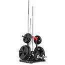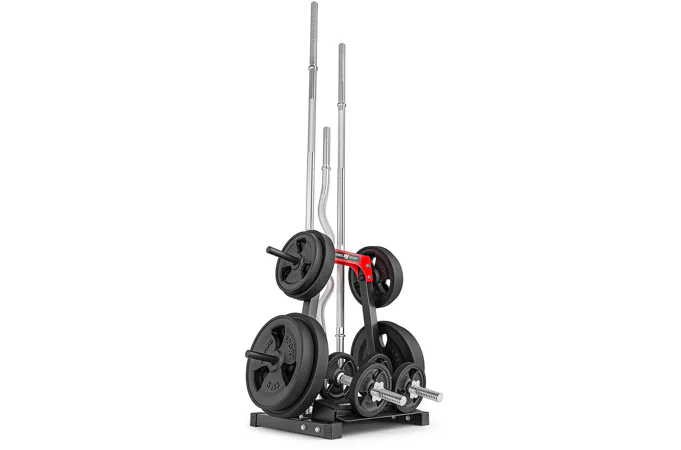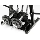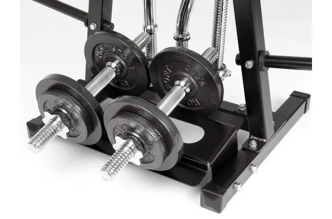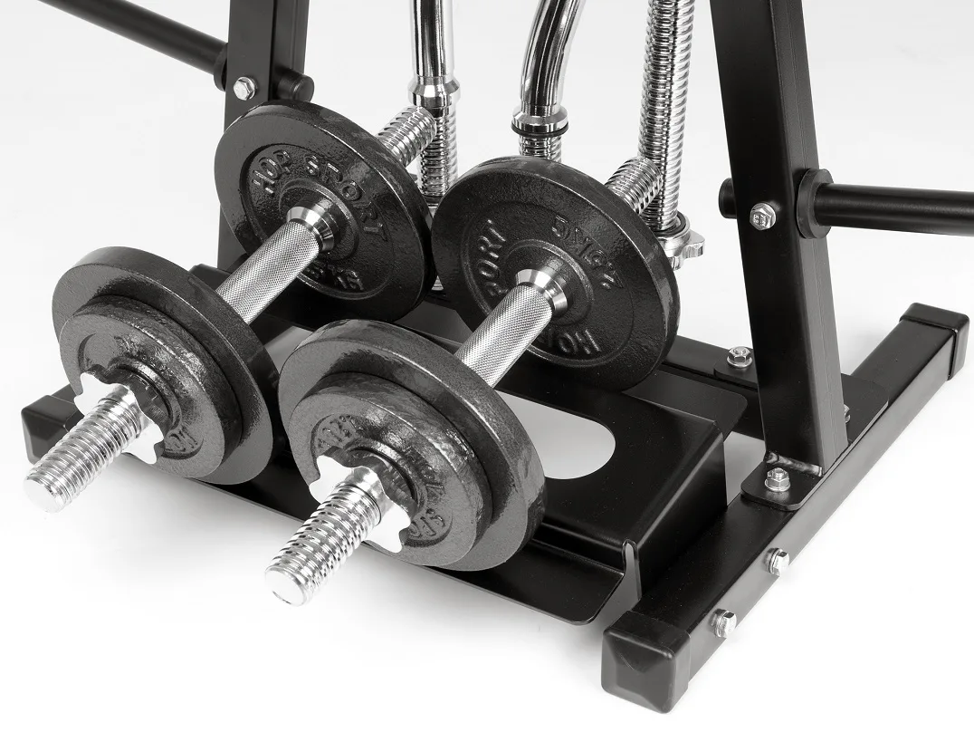 Na stojan je možné umiestniť aj 2 jednoručné činky a vďaka tomu je možné na stojan umiestniť celú malú domácu posilňovňu. Úchyty na osi sú s priemerom 30 mm, ale dajú sa do nich pohodlne umiestniť osi s priemerom 25 mm. Tŕne na kotúče sú s priemerom 25 mm.