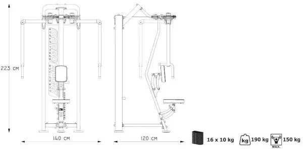 Stroj na posilnenie svalov ramien a chrbta MARBO MP-U224 je pevné, profesionálne vybavenie pre Vašu posilňovňu. Na výrobu boli zvolené oceľové profily 120x60x3mm a 80x40x3mm, ktoré zaručujú nadštandardnú pevnosť. Záťaž tvorí 16ks 10kg tehál. Celková váha závažia dodávaná so strojom je teda 160 kg.