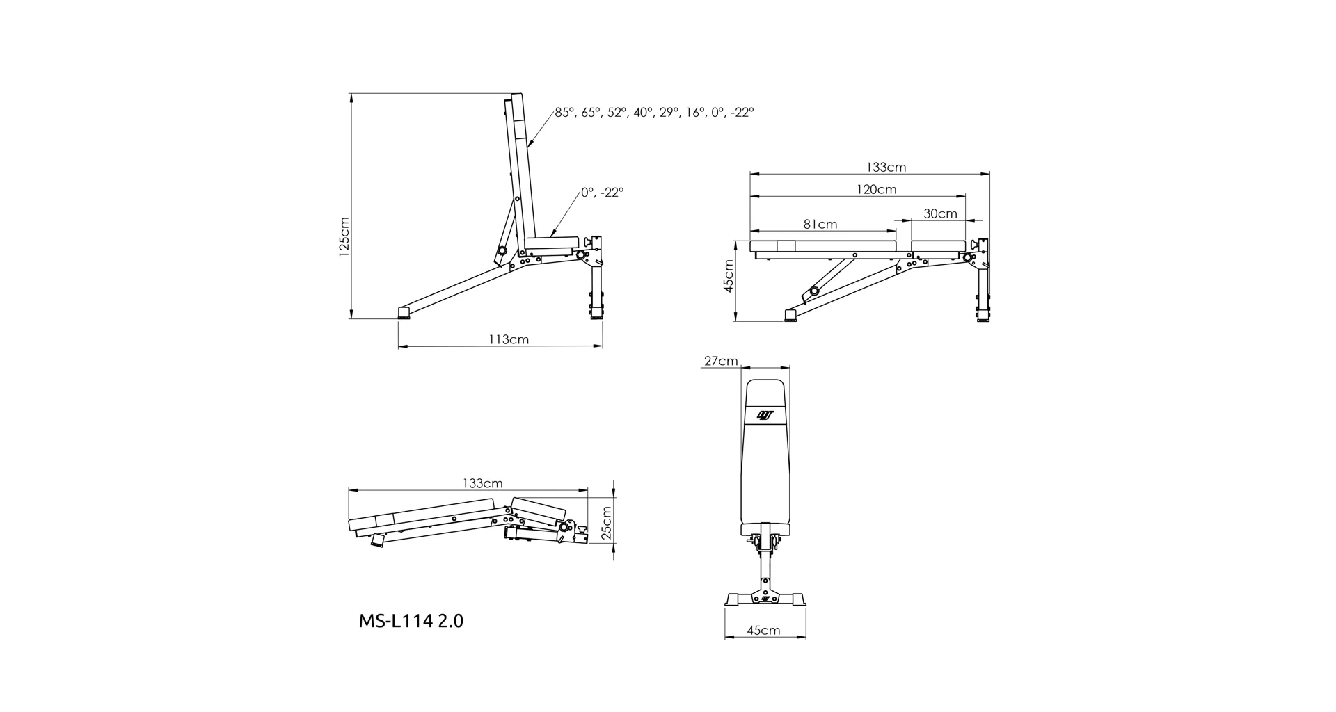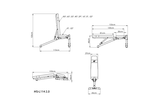Sedák je možné nastaviť do 2 polôh a jeho regulácia sa vykonáva pomocou čapu. Lavicu MS-L114 2.0 je možné v kombinácii so stojanom pod veľkú činku použiť aj k silovému tréningu, nosnosť lavice je 250 kilogramov. Polstrovanie je opatrené dvojitými švami pre maximálnu pevnosť. V najnamáhanejšom mieste je chrbtová opierka opatrená druhou vrstvou syntetickej kože s logom MARBO Sport. Koncovky stabilizátorov sú vyrobené zo špeciálnej zmesi gumy, ktorá zaisťuje ešte lepšiu stabilitu a ochranu podlahy ako u predchádzajúcej generácie lavíc.