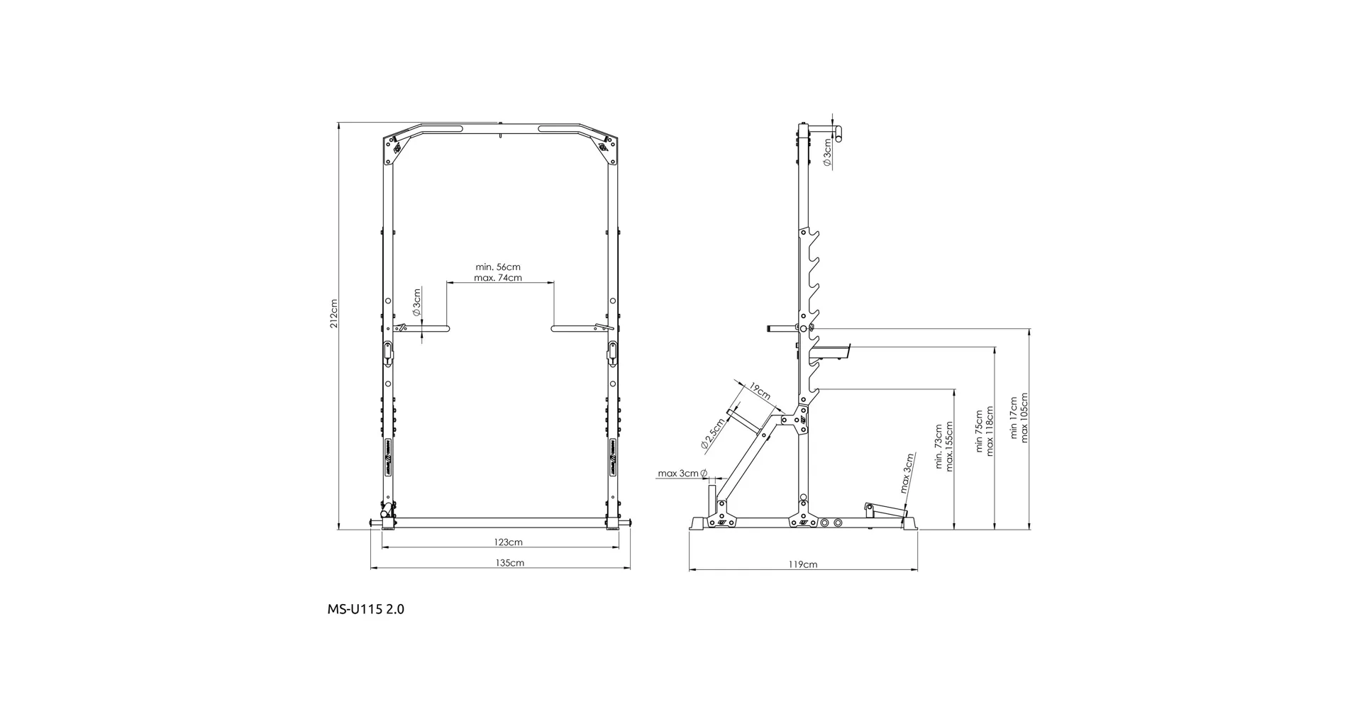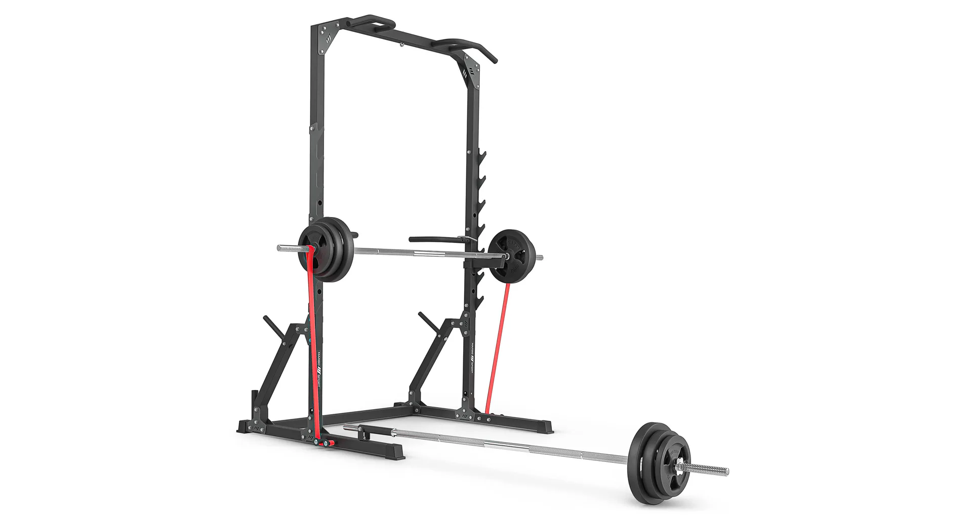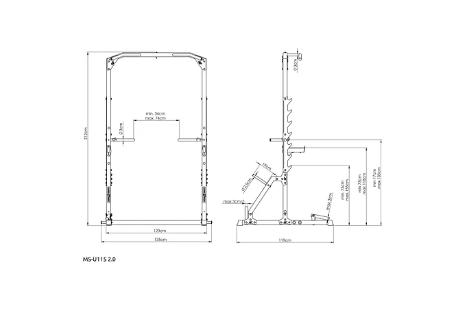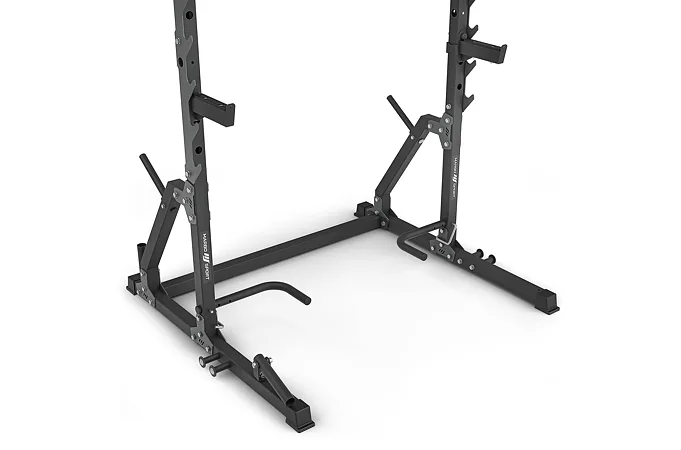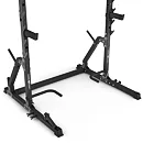 Po stranách rámu sa nachádza 7 párov hákov na odkladanie vzpieračskej osi. Háky majú rozsah výšky od 73 do 155 cm a vzdialenosť medzi nimi je 123 cm. Hákom asistujú bezpečnostné vzpery, ktoré majú čap, ktorý sa zasunie do otvoru v požadovanej výške a následne sa vzpera otočí, tým dôjde k jej zaisteniu. Vďaka gravitácii zostane vzpera pevne na svojom mieste, takže sa nemusíte báť o bezpečnosť ani počas tréningu s veľmi ťažkou činkou. Vzpery je možné nastaviť do 4 polôh v rozsahu výšky od 75-tich do 118-tich cm.