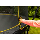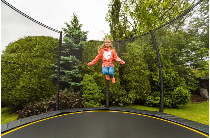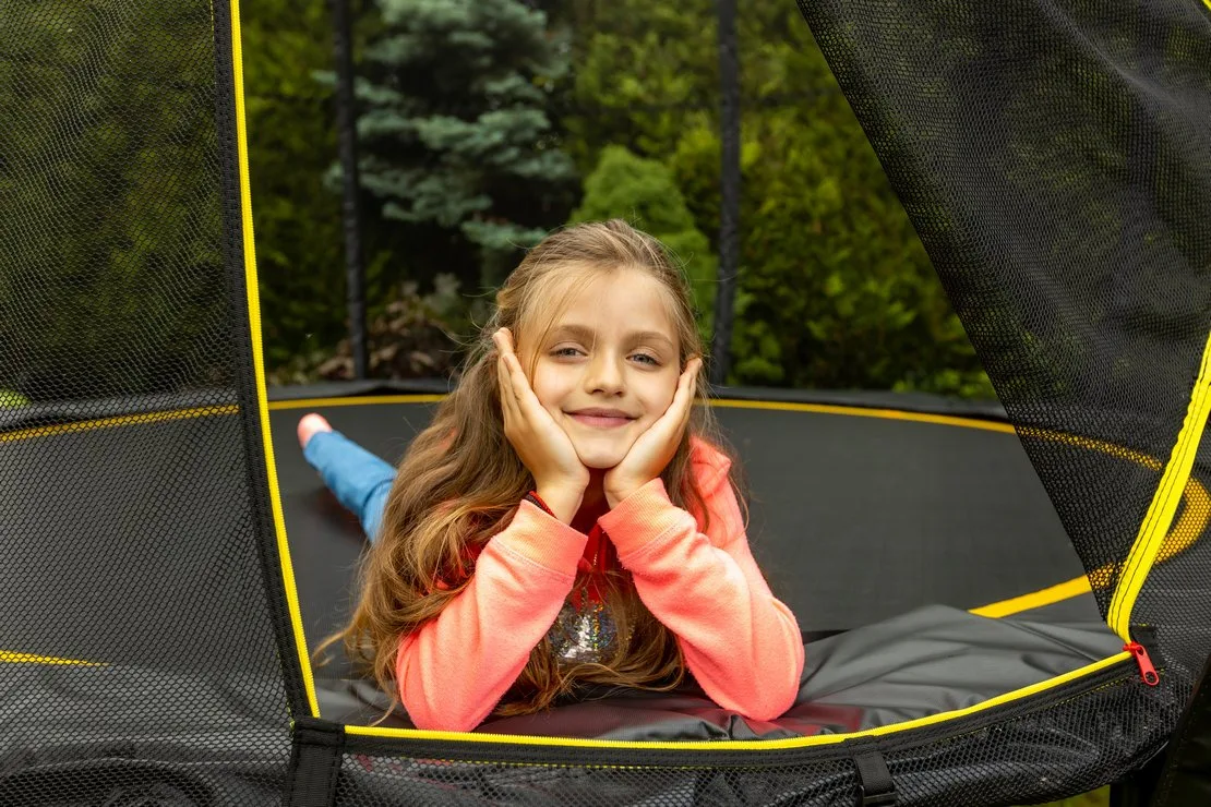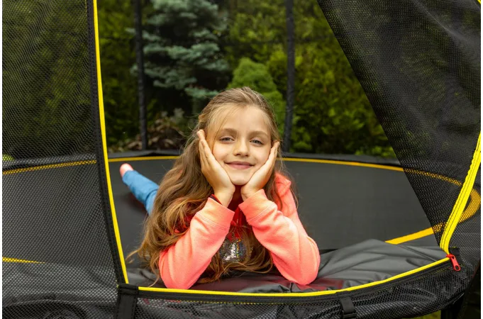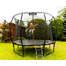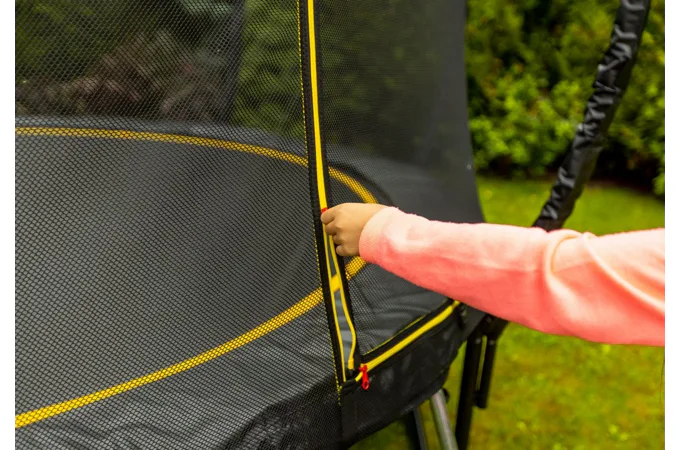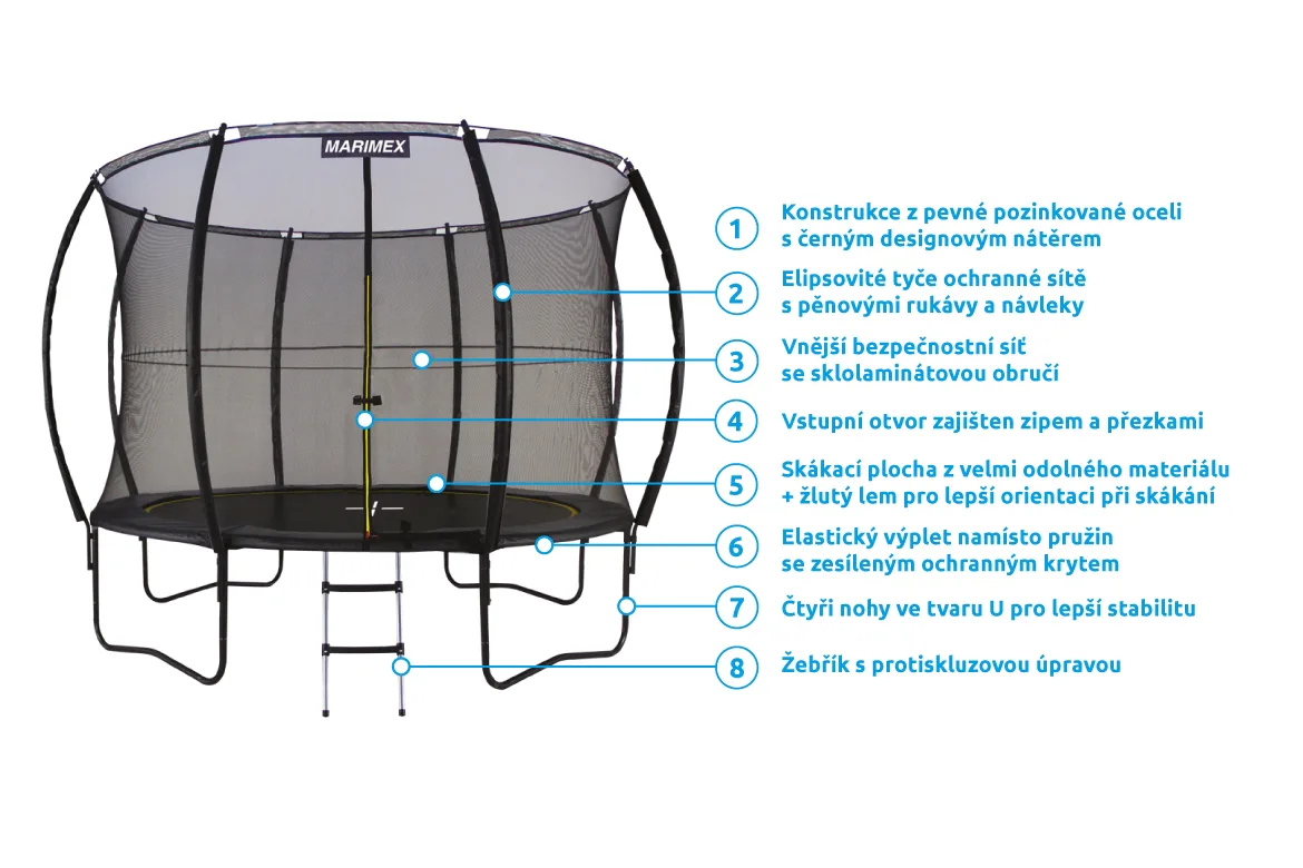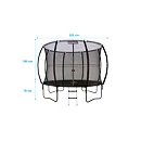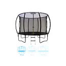 Pre maximálnu stabilitu je trampolína vybavená štyrmi pevnými nohami v tvare písmena U, ktoré bezpečne držia celú konštrukciu na mieste. Ochranná sieť je umiestnená na vonkajšej strane trampolíny a vďaka pevným tyčiam s penovým návlekom poskytuje spoľahlivú ochranu pri skákaní.
