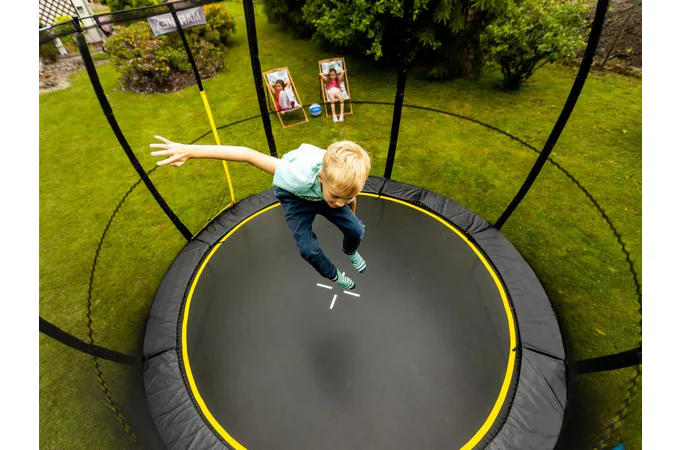 Hlavnou inováciou tejto trampolíny je bezpružinový systém, kde sú tradičné pružiny nahradené elastickým výpletom. Tento systém poskytuje vyššiu pružnosť odrazovej plochy a zároveň eliminuje možnosť nechceného kontaktu s pružinami. Skákacia plocha je vyrobená z kvalitného polypropylénu s UV ochranou, ktorý zaisťuje dlhú životnosť a odolnosť voči poveternostným vplyvom.
