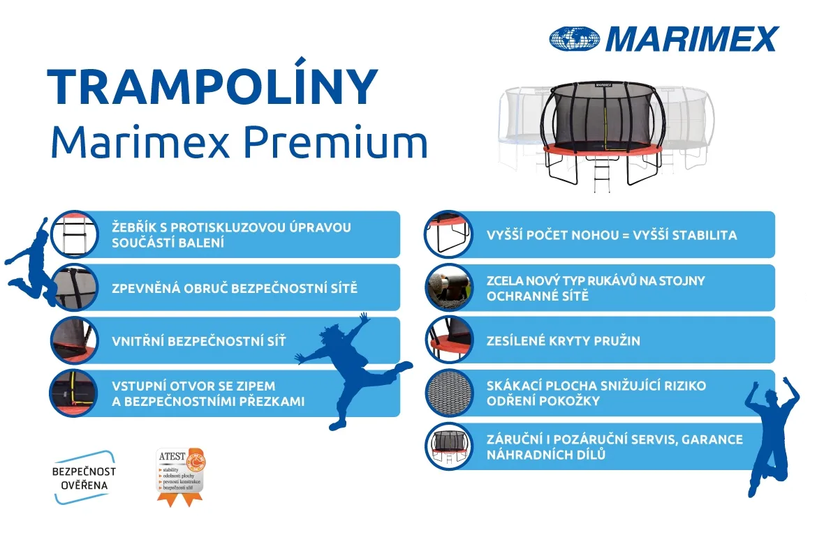 Na bezpečnostné prvky trampolín Marimex Premium je kladený veľký dôraz, preto sú radené medzi najbezpečnejšie a najspoľahlivejšie na slovenskom trhu.