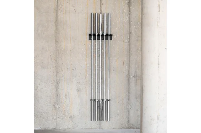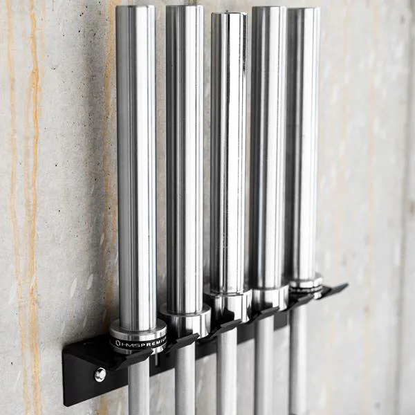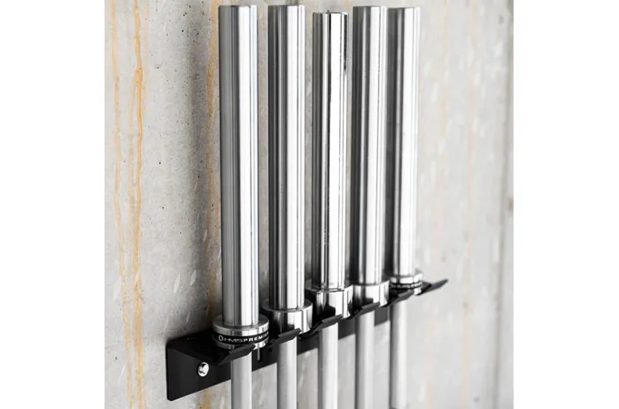 HMS STR45 je praktický nástenný držiak, ktorý umožňuje kompaktné a bezpečné uloženie 5 osí. Vďaka svojej konštrukcii sú osi umiestnené vedľa seba, čo pomáha šetriť cenný priestor – čo je obzvlášť dôležité v malých posilňovniach a domácich tréningových zónach.