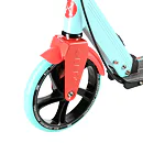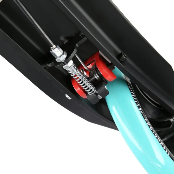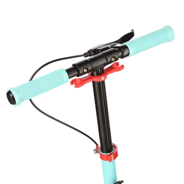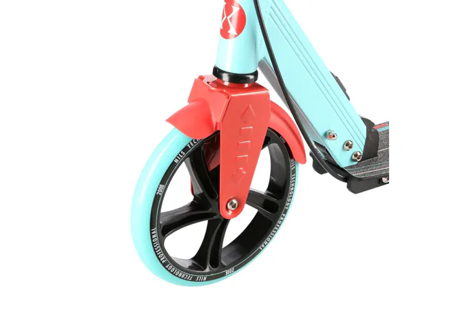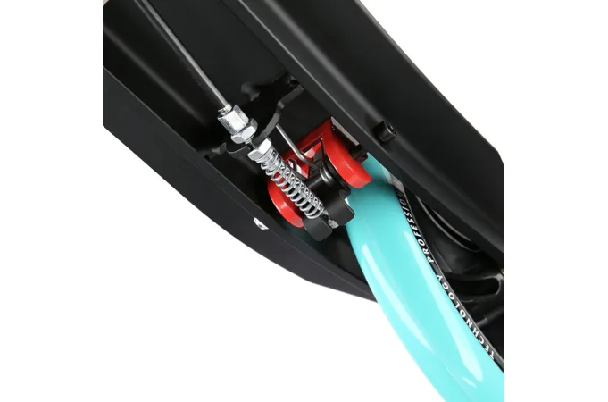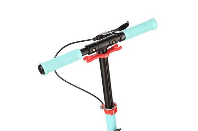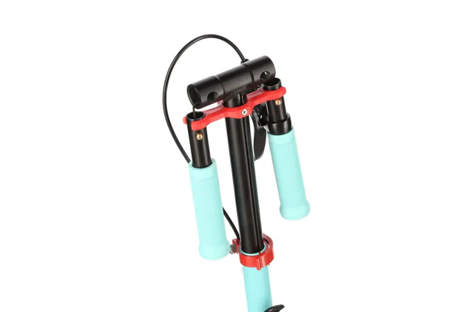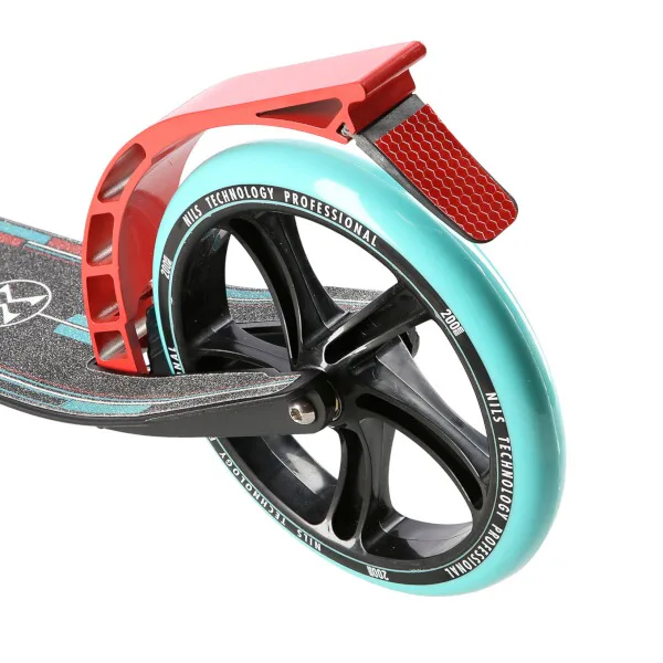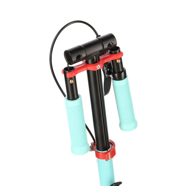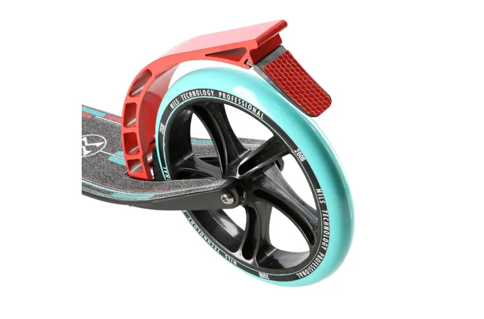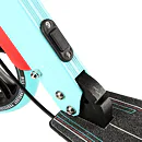 Zadný blatník slúži ako prítlačná brzda, ktorá ešte podčiarkuje brzdný účinok mechanickej brzdy ovládanej lankom z páčky na riadidlách, tie sú opatrené gumovými rukoväťami, ktoré zaisťujú pevný a pohodlný úchop. Veľké kolesá sú osadené ložiskami ABEC 7 a polyuretánovou pneumatikou s priemerom 200 milimetrov. Táto kombinácia zaisťuje rýchlu, plynulú a bezpečnú jazdu. Na stĺpiku riadidiel má svoje miesto držiak na odloženie fľaše s nápojom, ktorý nájde svoje využitie pri dlhších vychádzkach. Blatník na prednom kolese využijete, pokiaľ Vás zastihne dažďová prehánka.