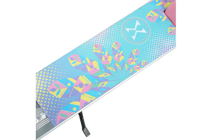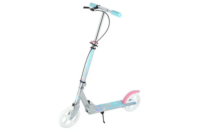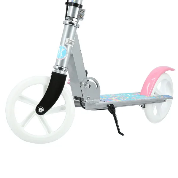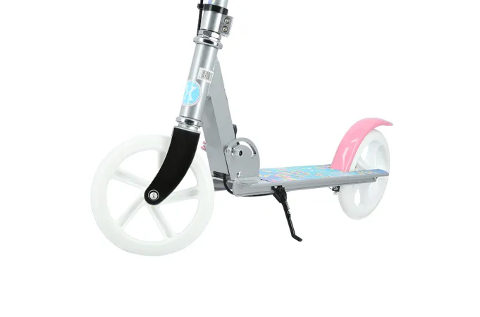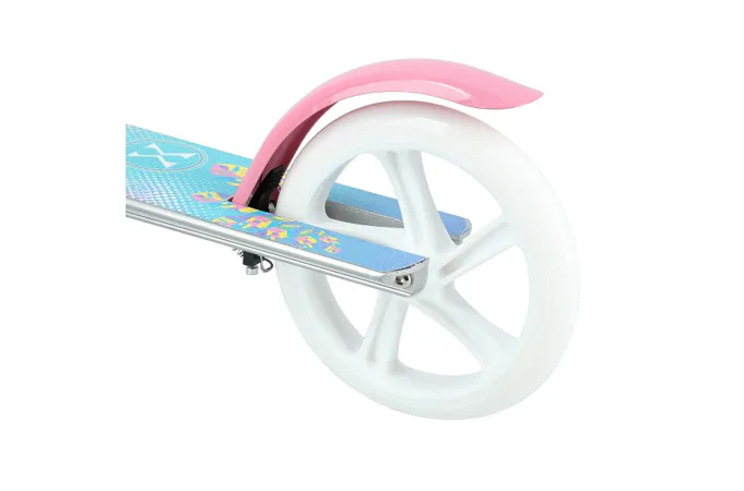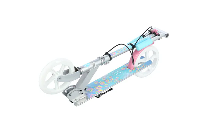 Zadný blatník slúži ako nožná, prítlačná brzda, pod blatníkom sa skrýva samostatná, malá brzda, ktorá je ovládaná páčkou z riadidiel. Riadidlá sú opatrené gumovými rukoväťami, ktoré zaisťujú pevný a pohodlný úchop. Veľké kolesá sú osadené ložiskami ABEC 7. Táto kombinácia zaisťuje plynulú a bezpečnú jazdu. Na ľavej strane nášľapu sa nachádza sklopný stojan.