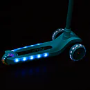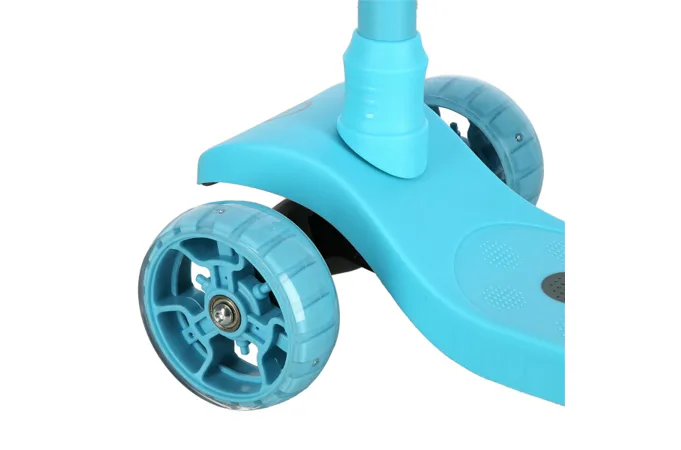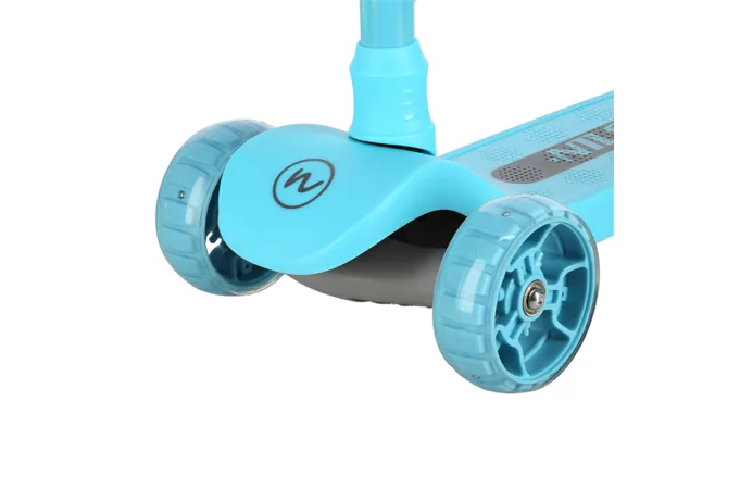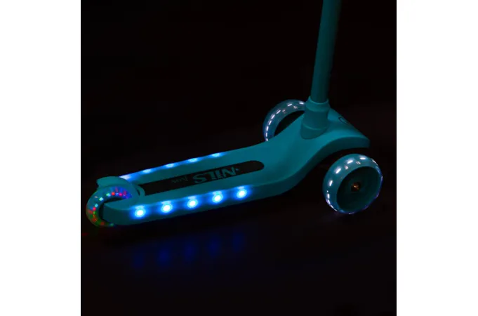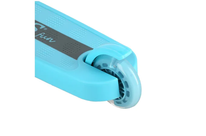 Predné kolieska s priemerom 120 milimetrov sú osadené bielymi LED diódami, zadné koliesko s priemerom 90 milimetrov diódami farebnými. Svietiace LED diódy slúžia ako zaujímavý, vizuálny prvok, zvyšujú záujem detí a v neposlednom rade zvyšujú viditeľnosť kolobežky napríklad za šera. Kolieska svietia automaticky počas ich otáčania. Ďalej sú kolieska osadené ložiskami ABEC 7 pre plynulú jazdu. Zadný blatník slúži ako nášľapná brzda na bezpečné zastavenie kolobežky.