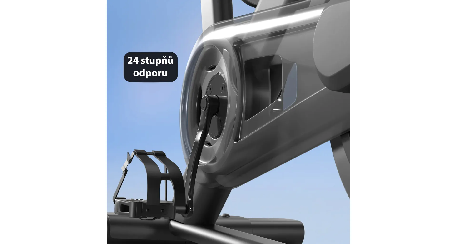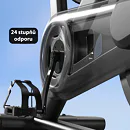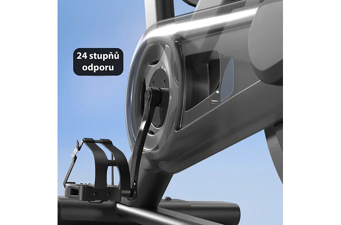 Odpor je elektronicky riadený v 24 stupňoch a uspokojí každého, či už začiatočníka alebo športovo zameraného cvičenca. Šlapací stred je osadený priemyselnými ložiskami. Robustná rámová konštrukcia s nosnosťou do 159 kg zaručuje dlhú životnosť cyklotrenažéra aj pri pravidelnom využívaní.