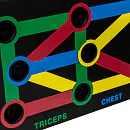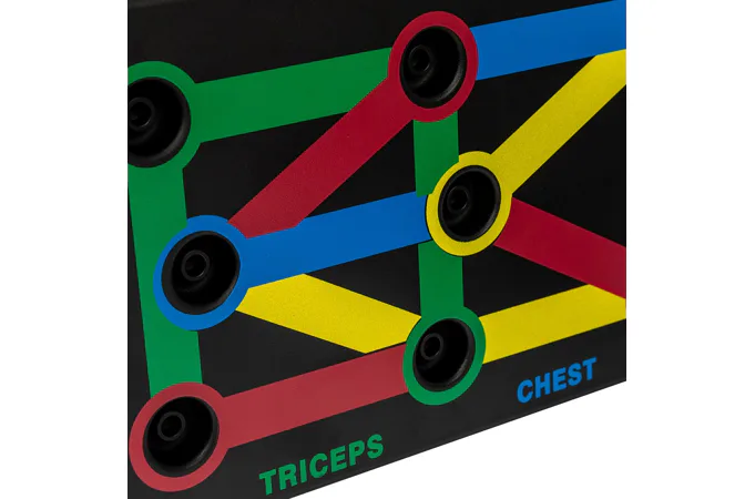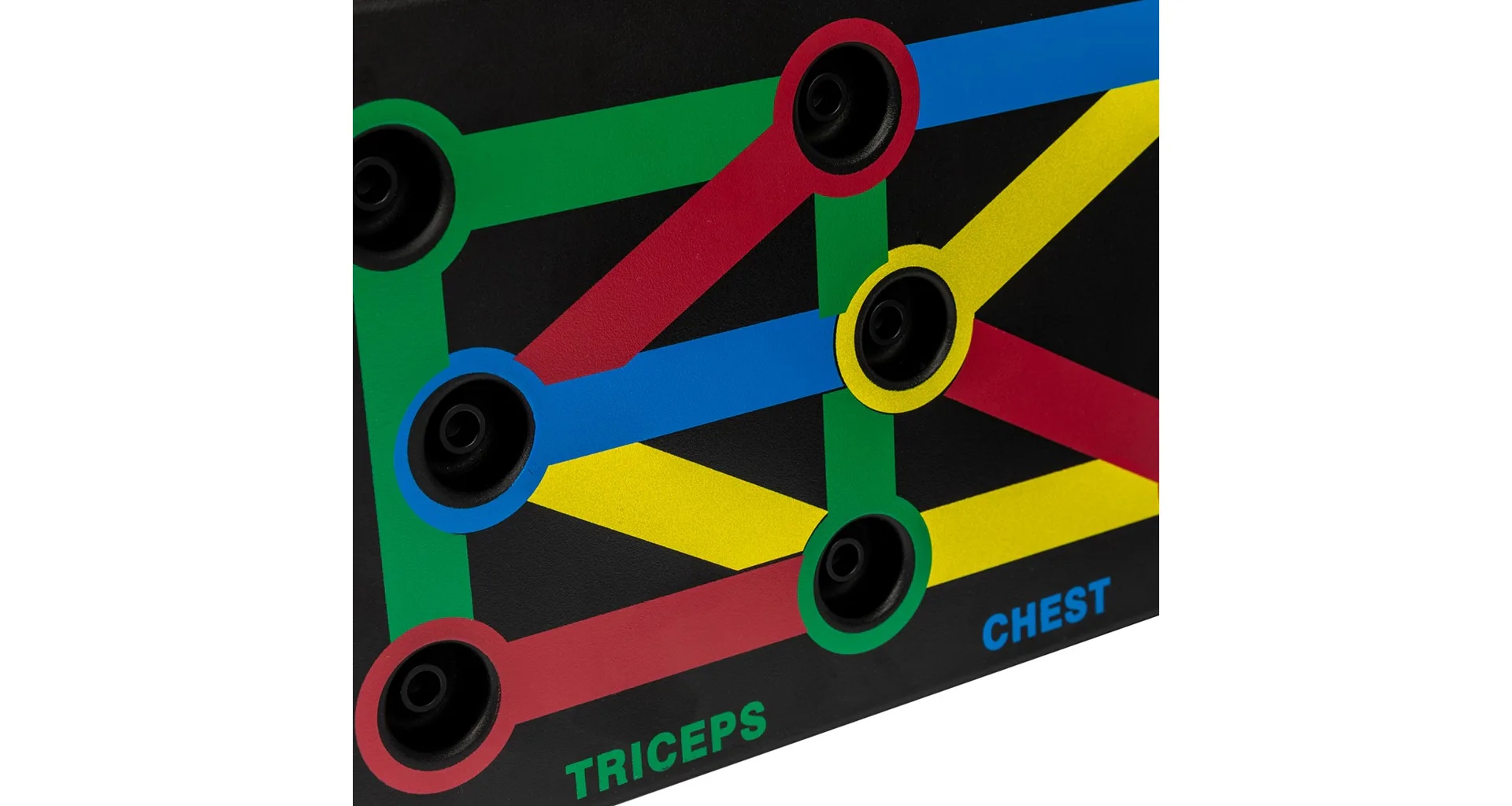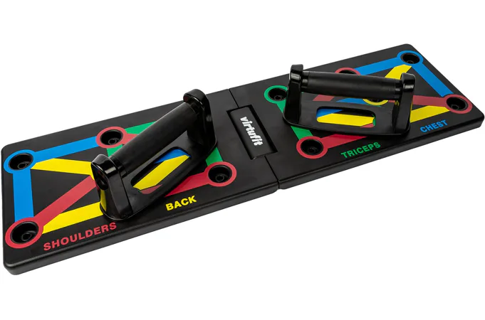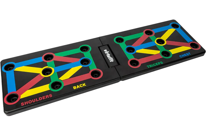 S multifunkčnou cvičebnou podložkou VIRTUFIT 12-in-1 Push Up Board môžete trénovať celú hornú časť tela s jedným nástrojom a to s vlastnou telesnou hmotnosťou! Vďaka tomu, že priložené podpery na kľuky sú nastaviteľné a môžu byť umiestnené v rôznych pozíciách, každá pozícia cieli na jednu z hlavných svalových skupín hornej časti tela. Farby označujú, ktorú svalovú skupinu precvičujete. Štyri hlavné svalové skupiny sú: hrudník, chrbát, tricepsy a ramená. Pri každom cviku navyše posilňujete aj brušné svaly.