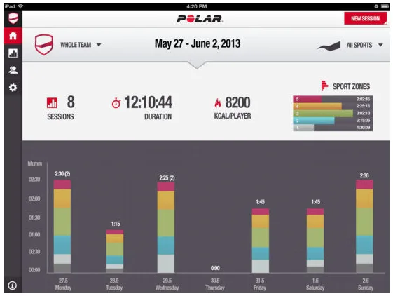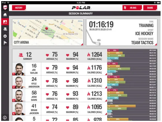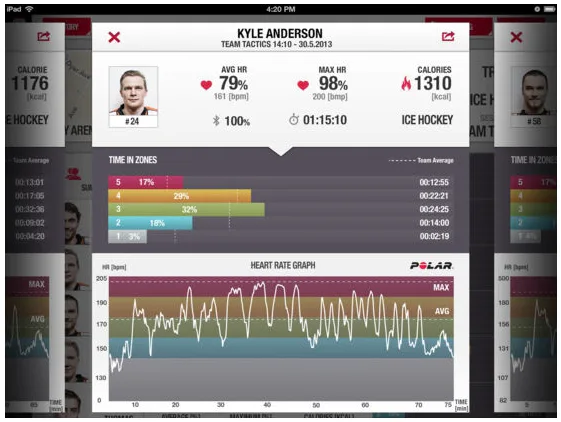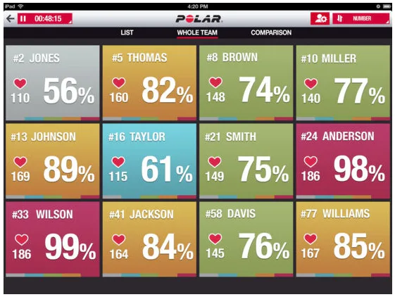 Následné náhľady umožňujú pozorovanie jedincov, prípadne celého tímu, porovnávanie jednotlivých športovcov počas tréningu. V rámci záznamu je možné sledovať aj priemernú tepovú frekvenciu a maximálnu dosiahnutú počas záznamu, kalorický výdaj, podiel strávený v jednotlivých aeróbnych zónach, krivku tepovej frekvencie, ..... vrátane týždenných prehľadov.