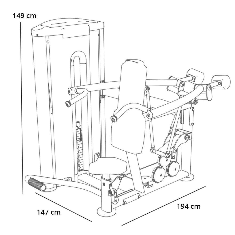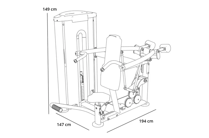 Posilovač ramen L090 se rozkládá na malém půdorysu o rozměrech (d x š x v) 194 cm, 147 cm a 149 cm, nezabere vám tedy moc prostoru a stále zůstane dostatek místa i na další stroje.