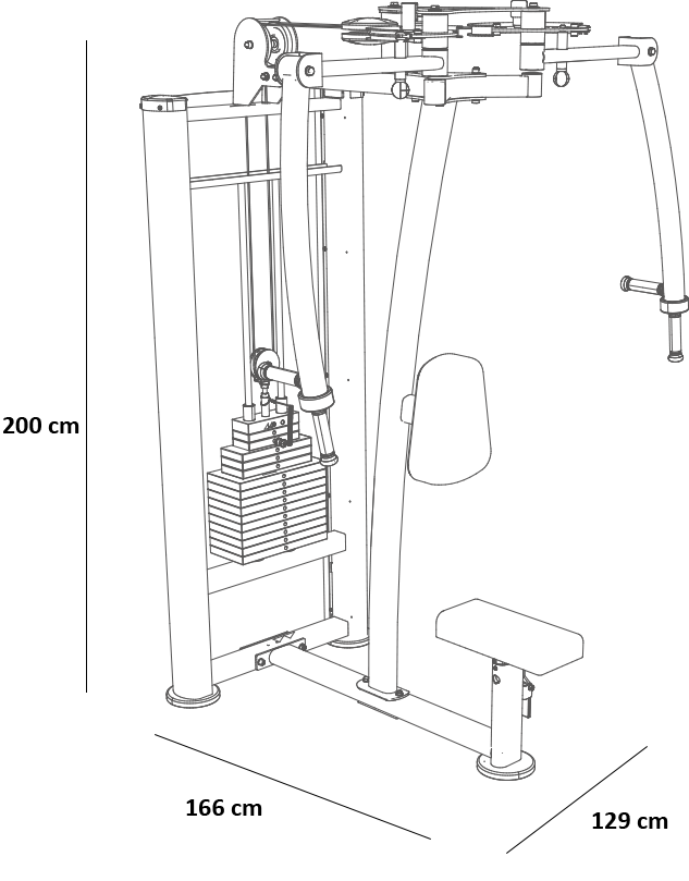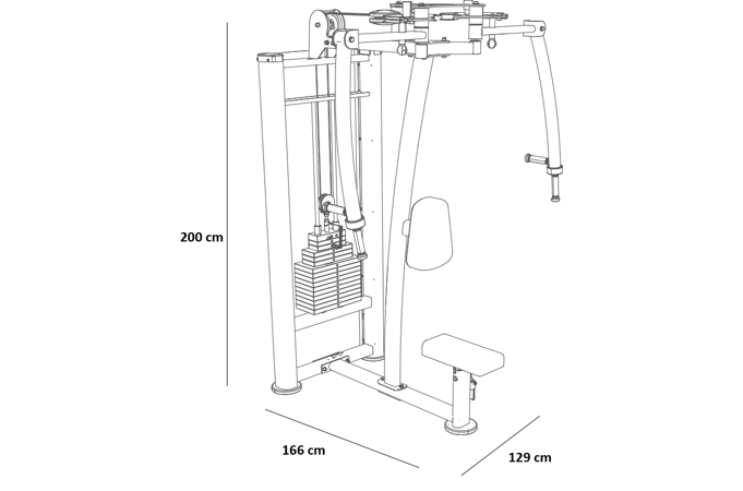 Profi posilovací stroj L410 se rozkládá na půdorysu o rozměrech (d x š x v) 166 cm, 129 cm a 200 cm, nezabere vám tedy moc prostoru a stále zůstane dostatek místa i na další stroje.