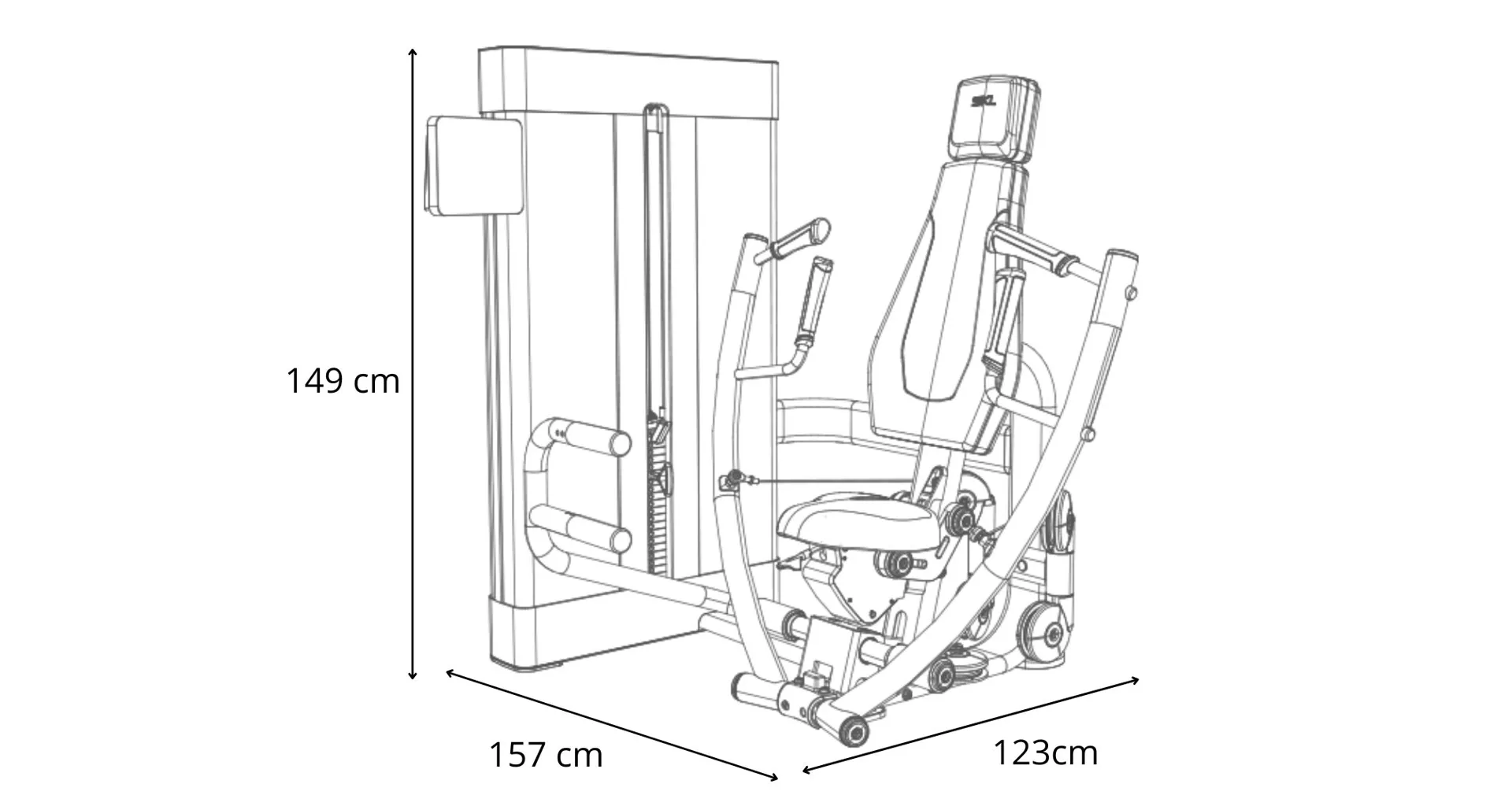Posilovač prsou Movemia M070 se rozkládá na malém půdorysu o rozměrech (d x š x v) 123 cm, 157 cm a 149 cm, nezabere vám tedy moc prostoru a stále zůstane dostatek místa i na další stroje.