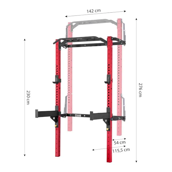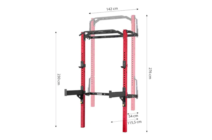 Power Rack KLT23 je pripevnený k stene, čo zabezpečuje jeho stabilitu a bezpečnosť. Keď ho nepoužívate, môžete ho jednoducho zložiť, takže nezaberie veľa miesta. To je obrovská výhoda tohto zariadenia, pretože ho môžu používať ľudia s obmedzeným tréningovým priestorom. Keď je stojan zložený pri stene, v najhlbšom bode zaberá od steny len 10 cm! Jedno z ramien je vybavené pneumatickým piestom, ktorý uľahčuje skladanie (zdvíhanie) stojana.