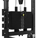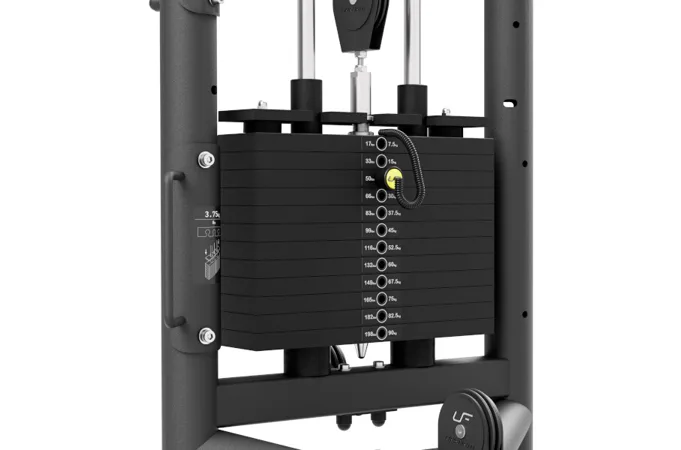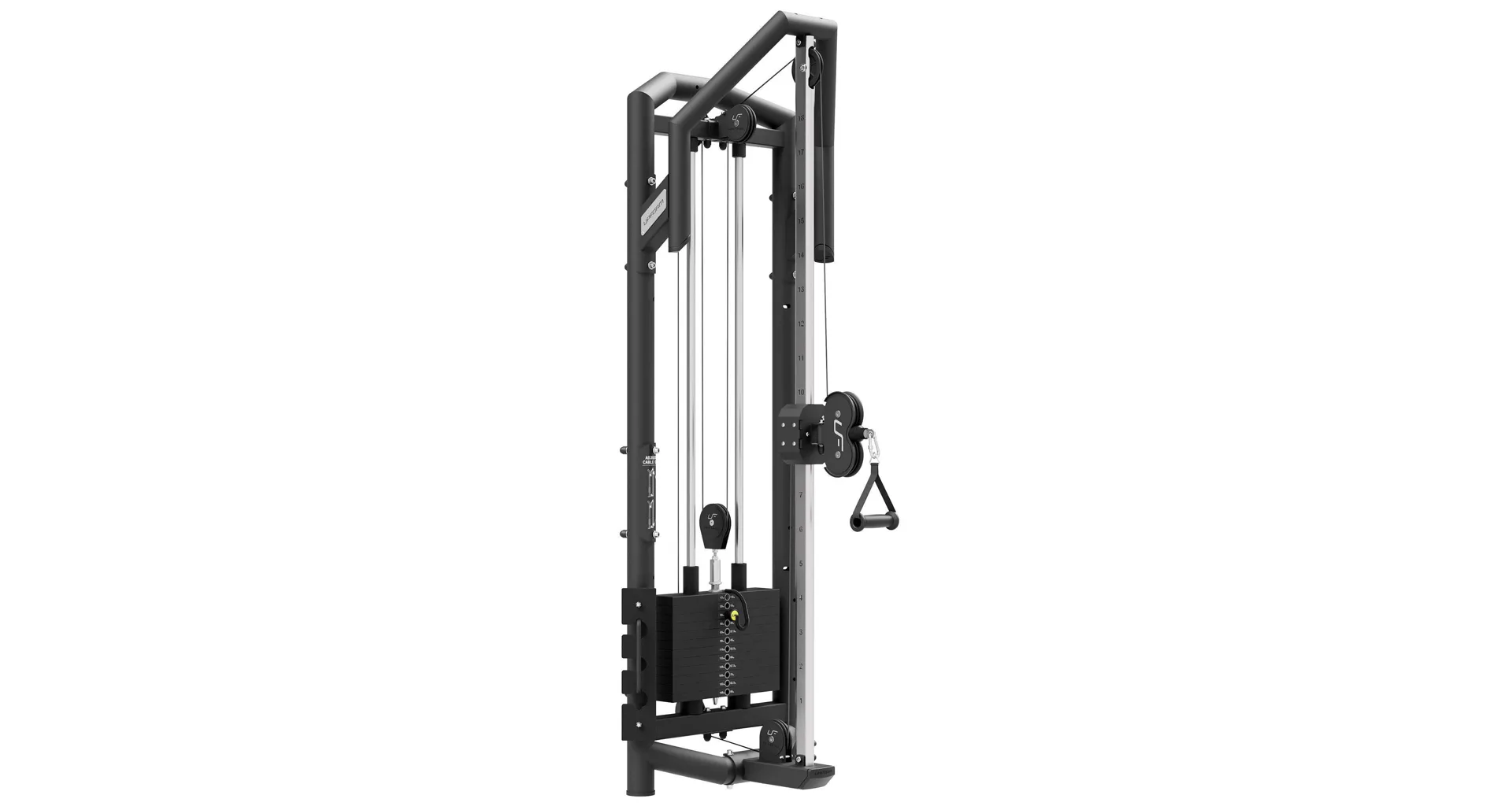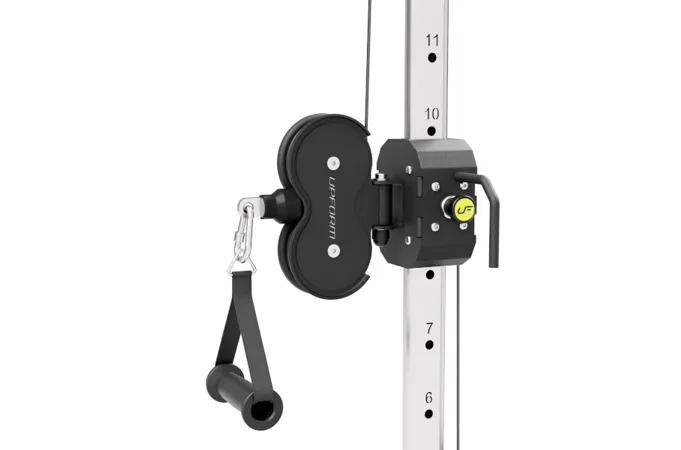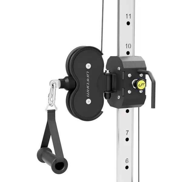 Posuvná kladka UpForm UF-001 je vybavená sadou závaží obsahujúcou 12 tehál s celkovou hmotnosťou 90 kilogramov odstupňovaných po 7,5 kg a jednou doplnkovou tehlou s hmotnosťou 3,75 kilogramov, tá sa umiestňuje nad prvú pevnú tehlu a používa sa na volenie. Volič váhy je opatrený nálepkami pre rýchlu voľbu požadovanej záťaže a istiaci čap je pripevnený na lanku, takže nehrozí jeho strata. Horné rameno sa nachádza vo výške 220 centimetrov, na stroji tak môže pohodlne trénovať ktokoľvek do výšky 200 cm. Všetky kladky sú schované pod kovovými krytmi s logom UpForm. Oceľové lanko je pokryté čiernym PVC, je zakončené masívnym okom a je odpružené gumovým tlmičom. Posuvný mechanizmus je opatrený madlom pre ľahký presun a pružinovým, istiacim kolíkom. Pojazd je možné nastaviť do 18-tich polôh, ktoré sú číslované.