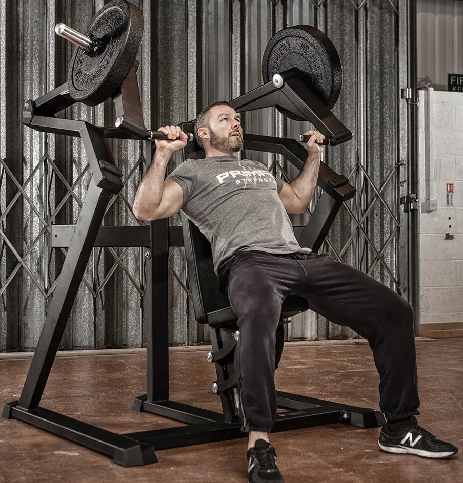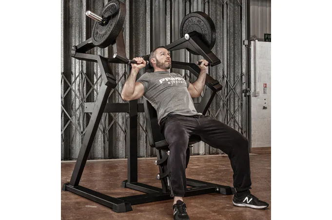Posilovací stroj PRIMAL Commercial tlaky na ramena vsedě je profesionální stroj určený k procvičování ramenních svalů za pomoci tlaků v sedě.