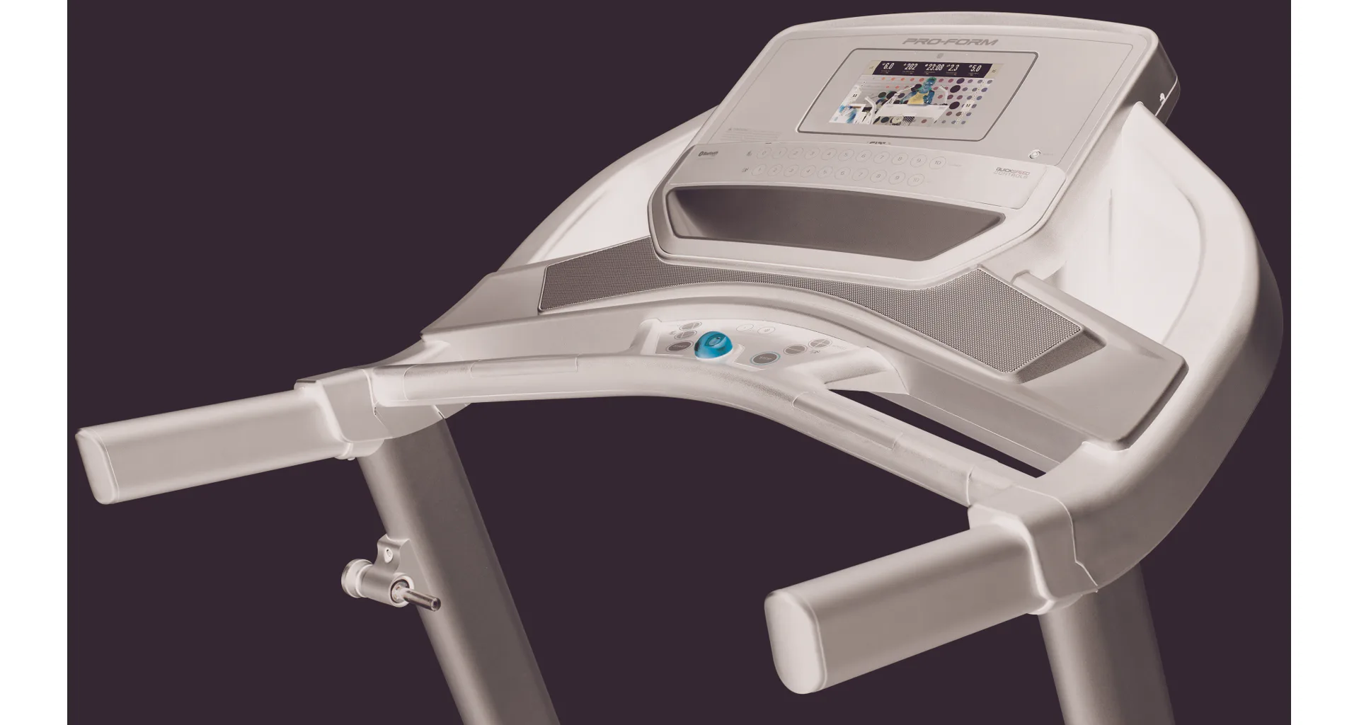 Součástí běžeckého pásu ProForm Trainer 9.0 jsou duální 2" reproduktory kompatibilní s iPodem, systém SpaceSaver pro snadné složení, transportní kolečka a držáky na lahev a příslušenství.