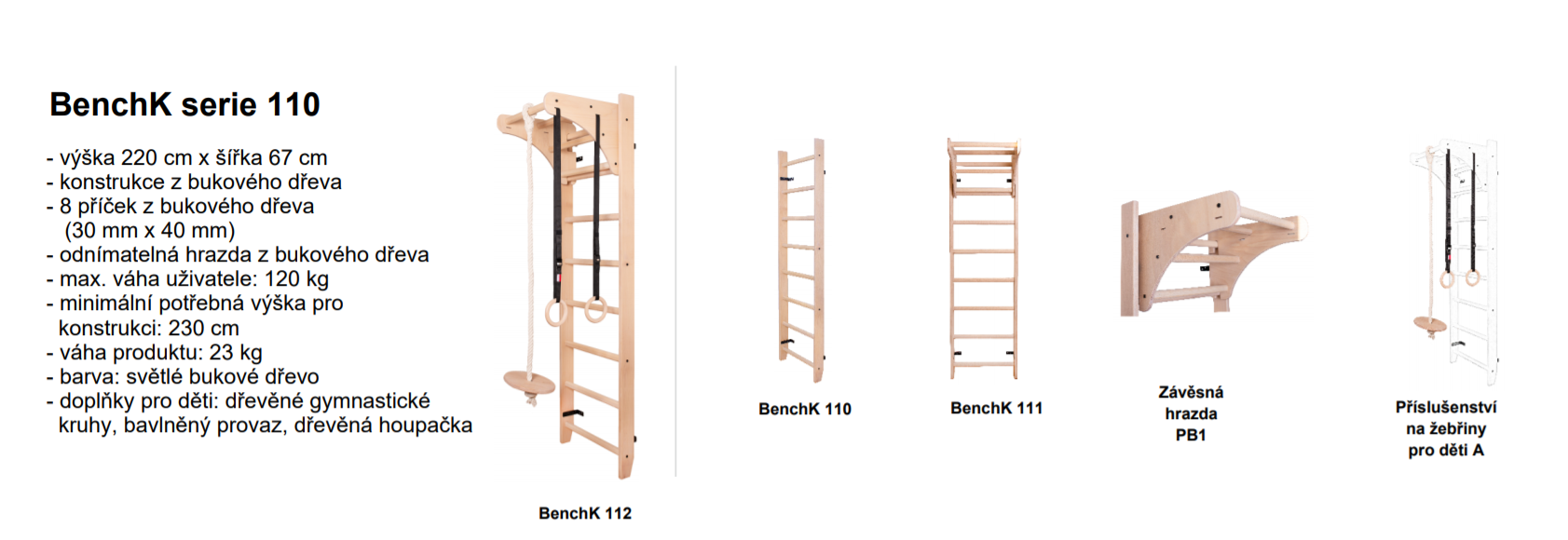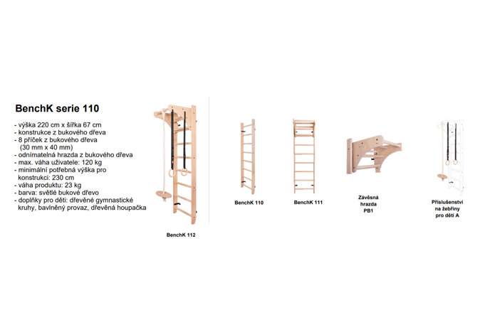 Rebriny BenchK 110 s rozmermi 220 x 67 cm sú navrhnuté ako pre najmladších športových nadšencov, tak aj teenagerov či dospelých. Vďaka špeciálnym doplnkom, ako sú gymnastické kruhy alebo lano s hojdačkou, je možné trénovať deti formou zábavných hier.