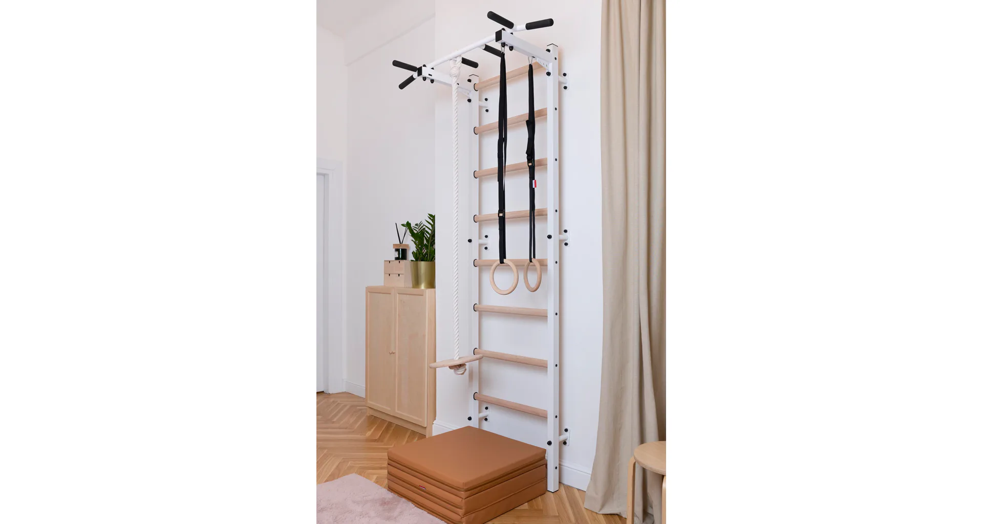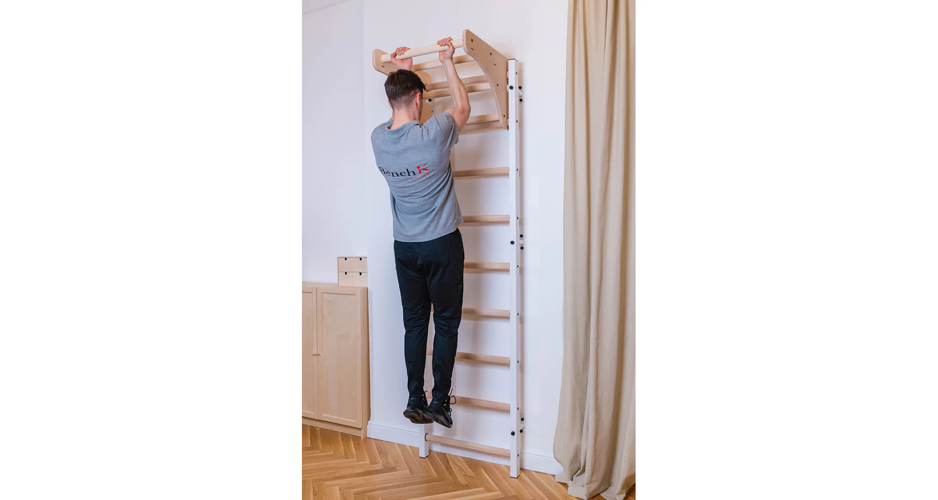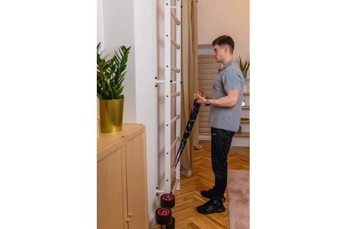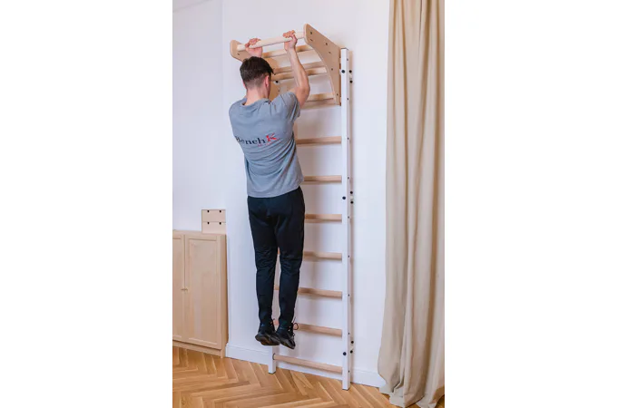 Konštrukcia je vyrobená z odolného kovu a priečky z bukového dreva. Oválne priečky s profilom 30 x 40 mm poskytujú dokonalý úchop. Drevo je ručne napustené olejom a nehrozí tak lúpanie laku. Rebriny sú nenáročné na priestor a zmestia sa do akejkoľvek miestnosti.