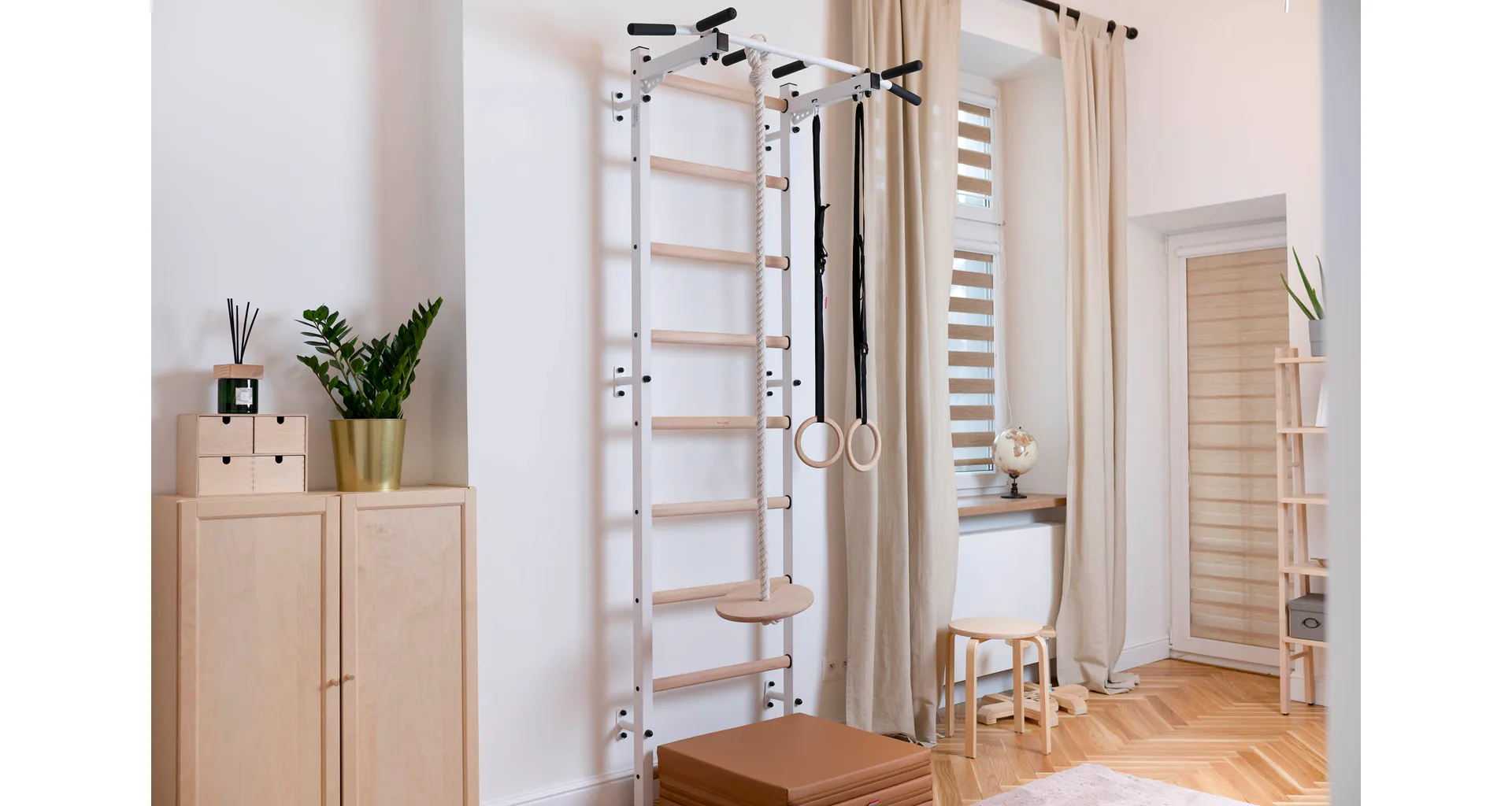 Vyobrazené komponenty nie sú súčasťou objednávky, ale je možné si ich dokúpiť. Jedná sa o hrazdu, bradlá, lavičku, gymnastické kruhy a lano s hojdačkou, madračku.