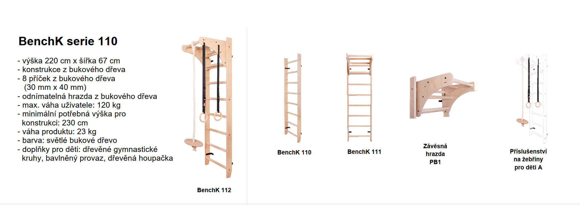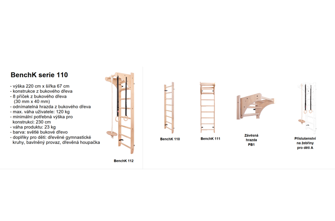 Rebriny s rozmermi 220 x 67 cm pre deti BenchK 112 sú navrhnuté tak, aby motivovali najmladších športovcov k aktivite. Vďaka špeciálnym doplnkom, ako sú gymnastické kruhy alebo lano s hojdačkou, je možné trénovať deti formou zábavných hier.