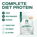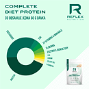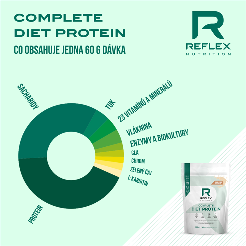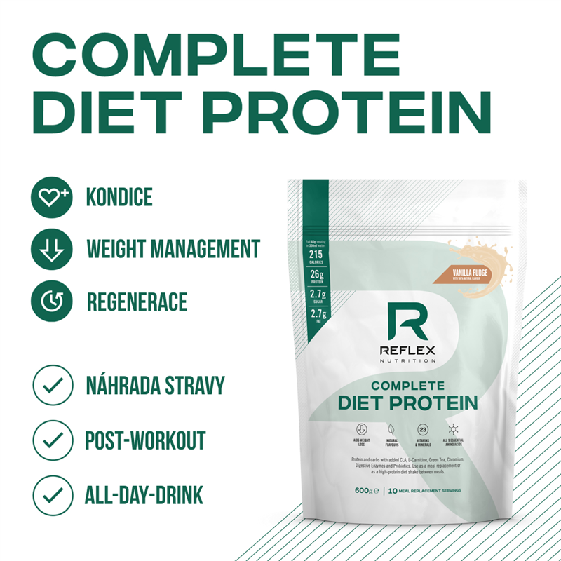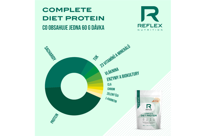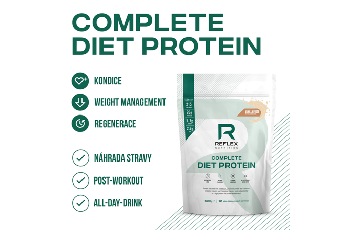 Complete Diet Protein je zmes srvátkového koncentrátu (grass fed kvalita), hrachového, tekvicového a ryžového proteínu + hydrolyzovaného waxy kukuričného škrobu + 23 vitamínov a minerálov + komplexu enzýmov + prospešných biokultúr + CLA, zeleného čaju a L-karnitínu. Complete Diet Protein je určený pre nahradenie jedla (MRP – meal replacement) alebo pri použití polovičnej dávky ako vysokoproteínový nápoj po tréningu alebo kedykoľvek počas dňa.
