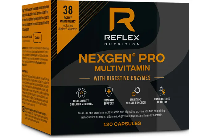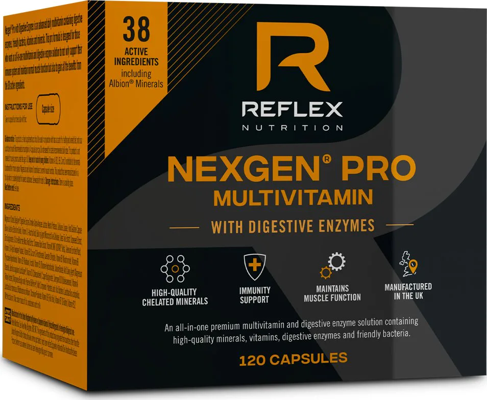 NEXGEN® PRO +DIGESTIVE ENZYMES je prémiový all-in-one multivitamín s obsahom bioaktívnych foriem vitamínov, organicky viazaných minerálov, bioaktívnych enzýmov, živých probiotických kultúr a rastlinných extraktov = 38 biologicky aktívnych zložiek vo vyváženom pomere. Sofistikovaná formulácia produktu vychádza z prírodného modelu, kde sa jednotlivé vitamíny a minerály obvykle nevyskytujú izolovane, ale vždy v kombinácii s dôležitými organickými nosičmi, fytonutrientmi, živými kultúrami, enzýmami a ďalšími bioaktívnymi faktormi. Maximálna využiteľnosť je garantovaná nielen kvalitou a čistotou použitých zdrojov, ale aj vďaka tzv. delenému systému dávkovania. NEXGEN® PRO + DIGESTIVE ENZYMES je kompletne vyrobený vo Veľkej Británii.