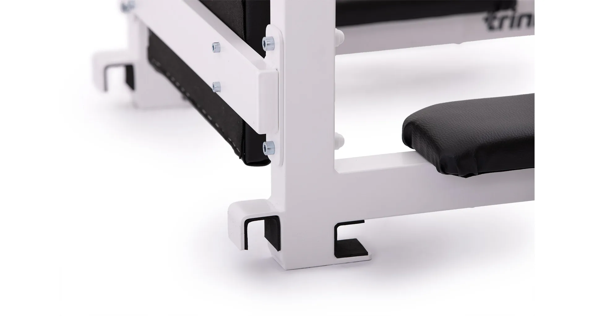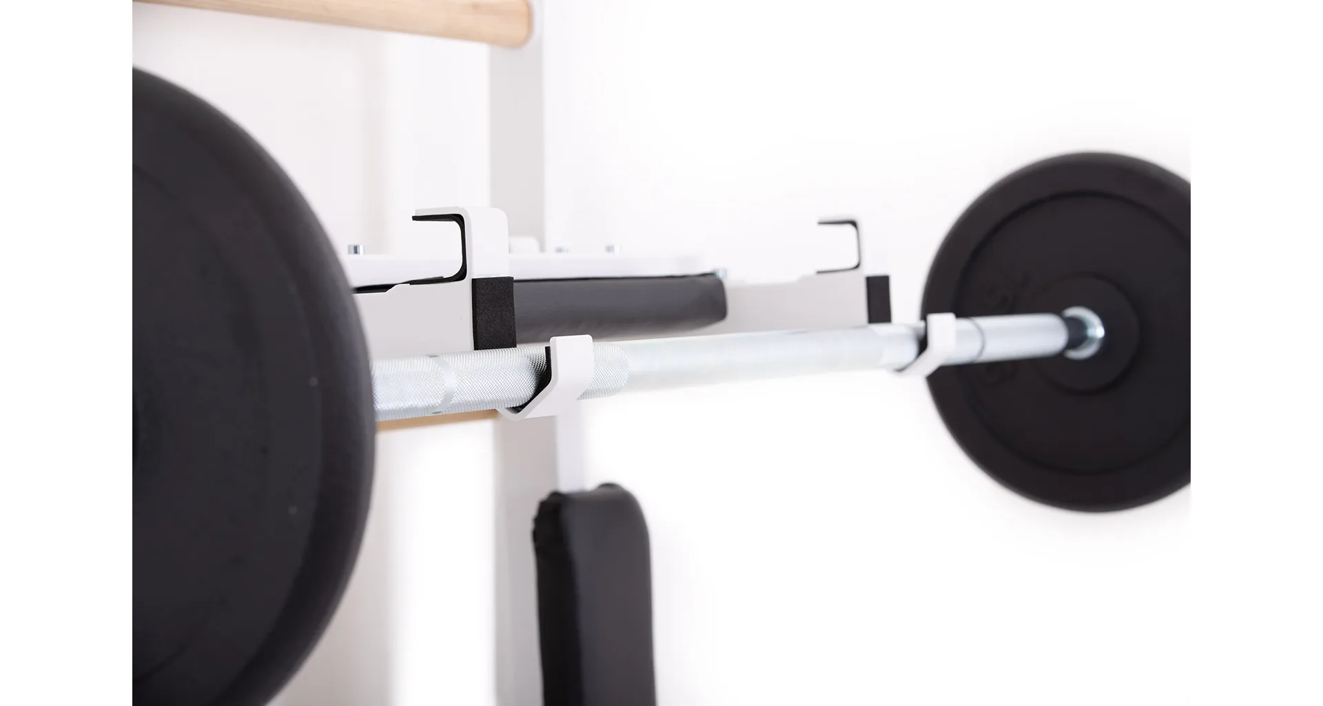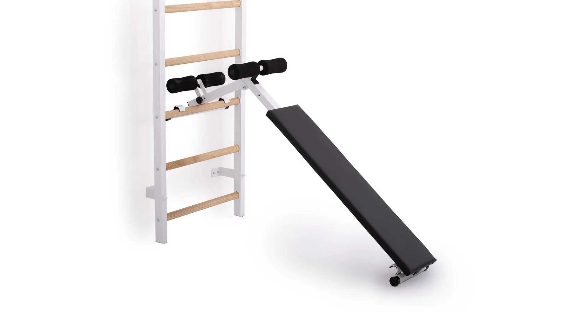 Součástí balení je kompletní upevňovací materiál do zdi – 4 horizontální úhelníky o tloušťce 5 mm, lakované vypalovanou barvou a sada vratových šroubů do ribstole. Stabilní a designově zdařilé uchycení žebřiny do zdi lakovaným úhelníkem skrz bočnici ribstole. Levnější ribstole naproti tomu většinou drží jen plechové úchyty na samořezy.