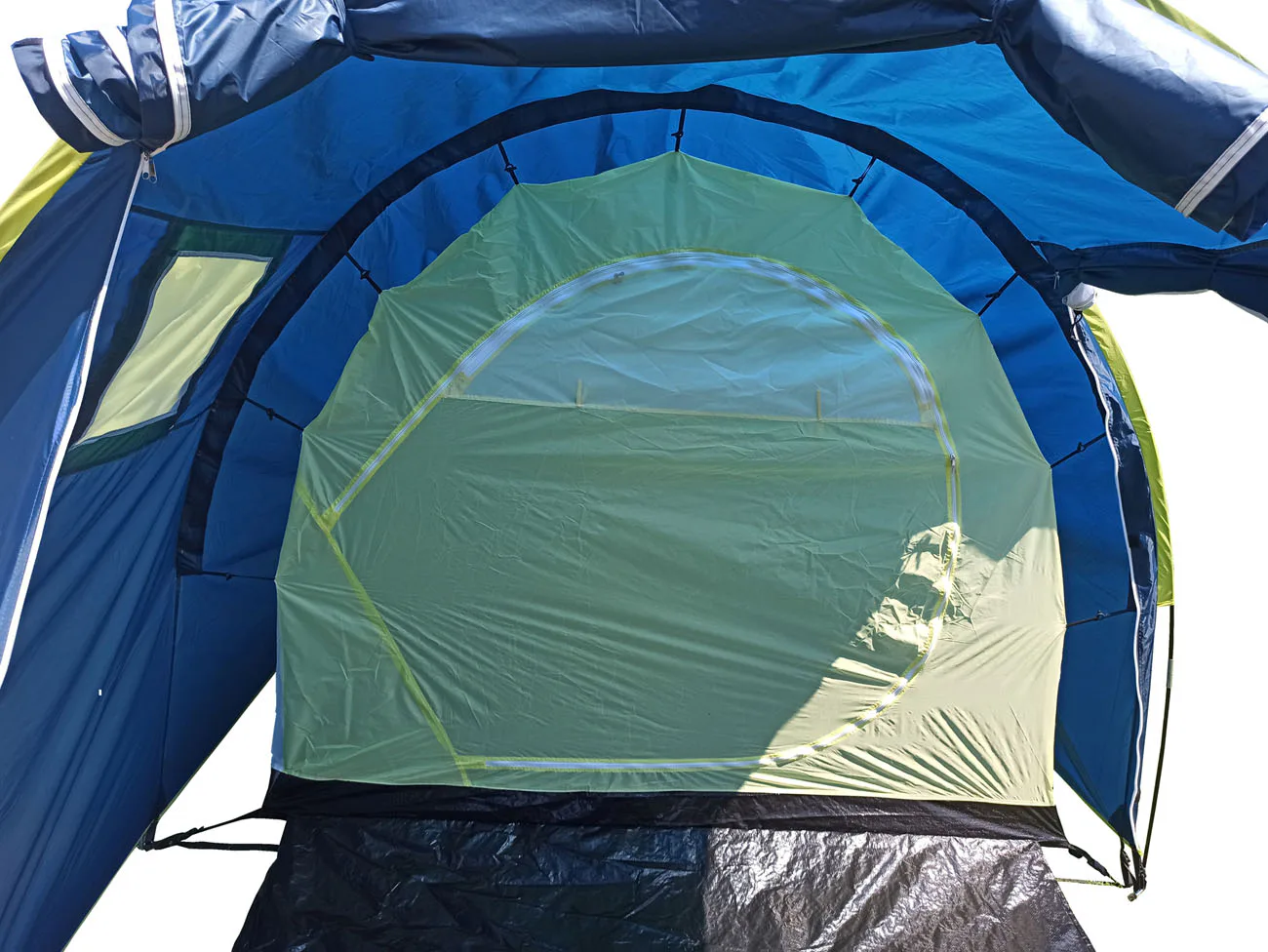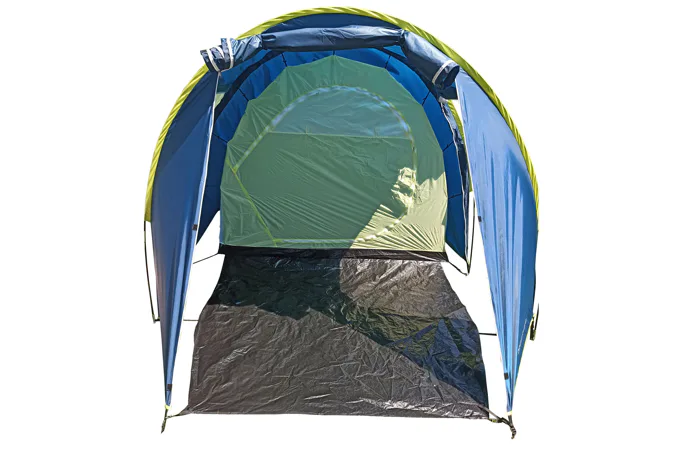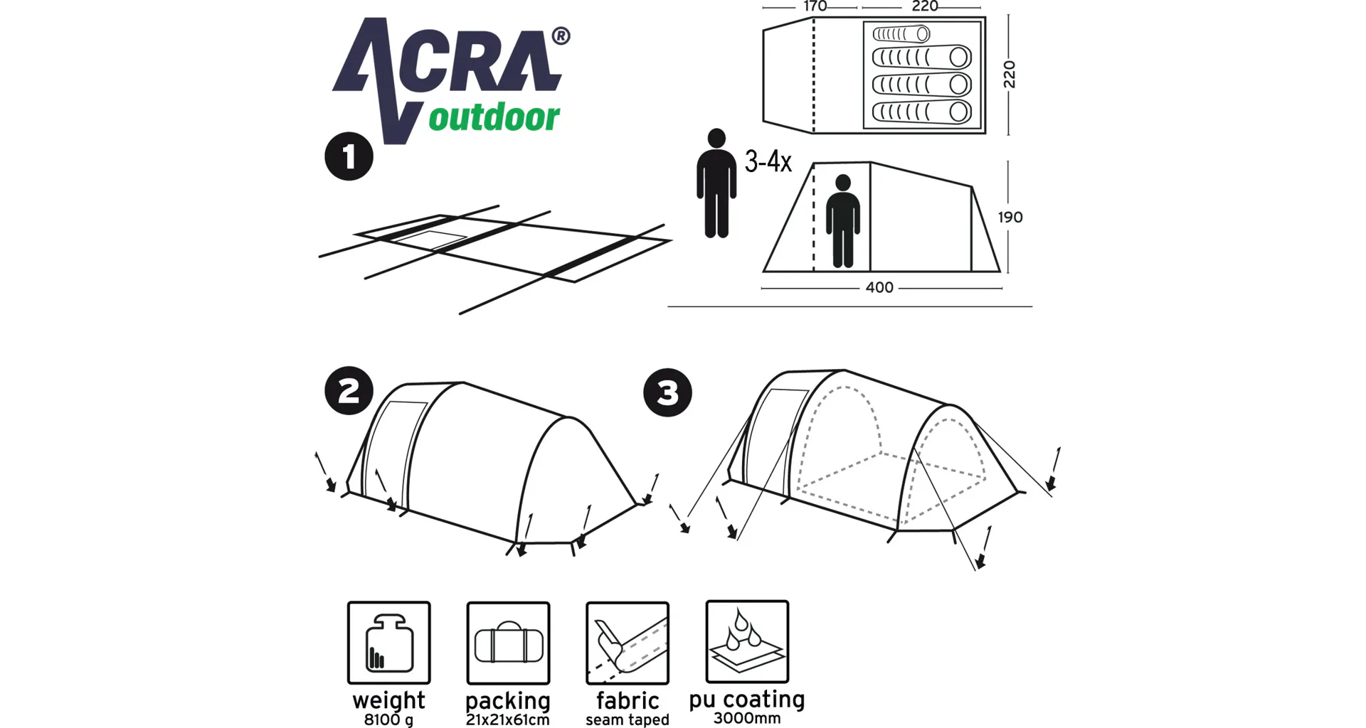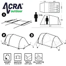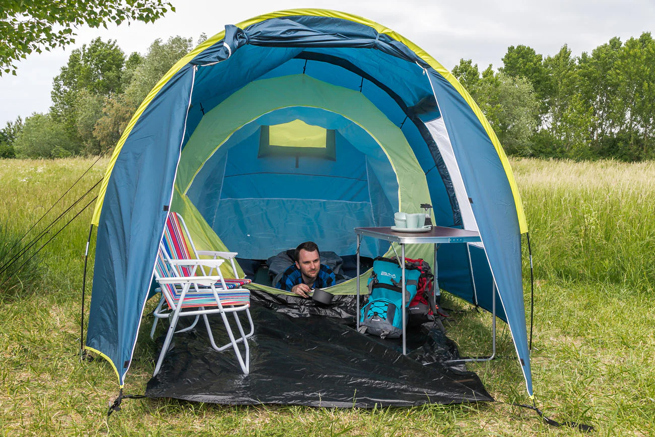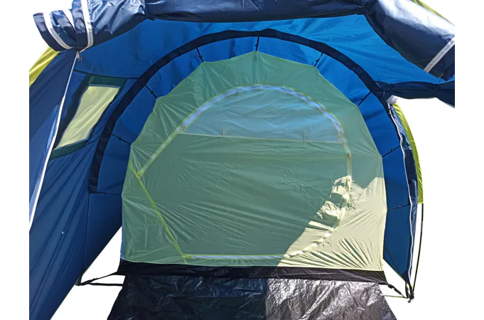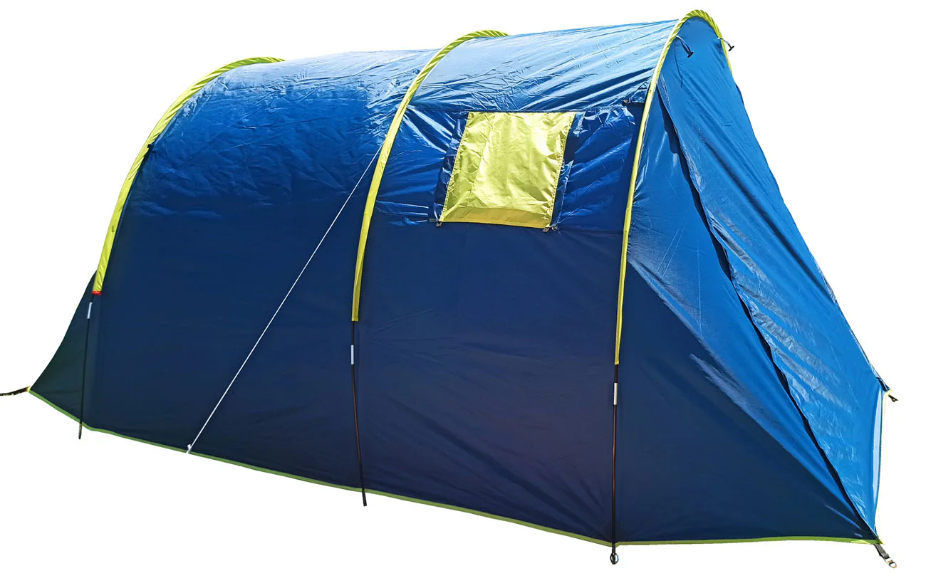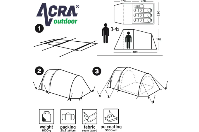Rodinný stan BROTHER ST18 pre 4 osoby v tvare tunela s rozmerom 400 cm (dĺžka vrátane predsiene) x 220 cm (šírka stanu) x 190 cm (výška stanu v predsieni), jedna veľká spálňa s rozmerom 220 x 220 cm, zhrňovacie strany stanu, podlaha v predsieni s rozmermi 180 cm dĺžka x 220 cm šírka.