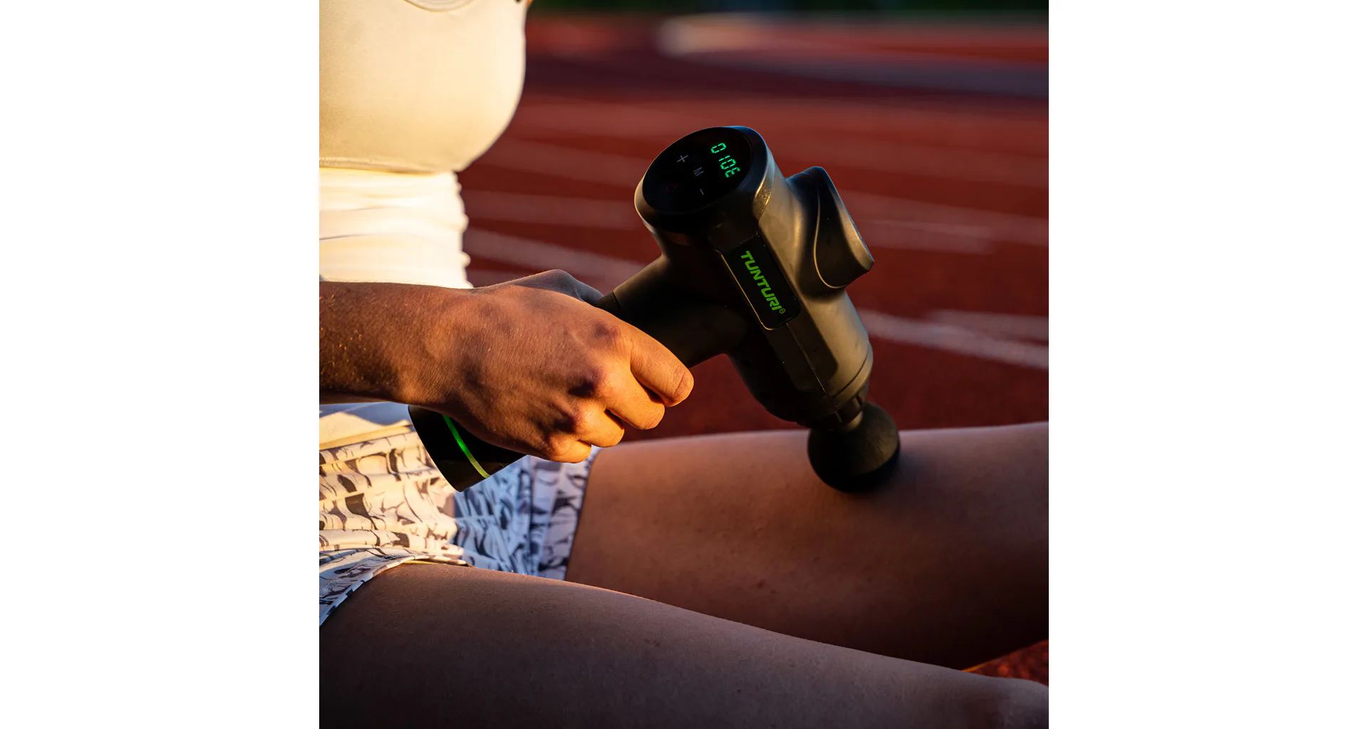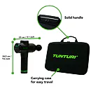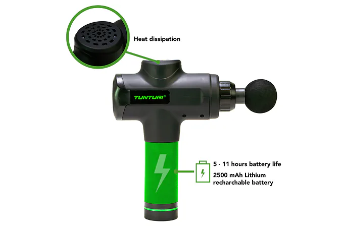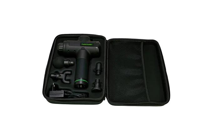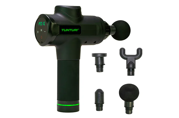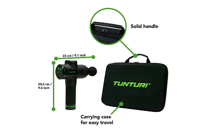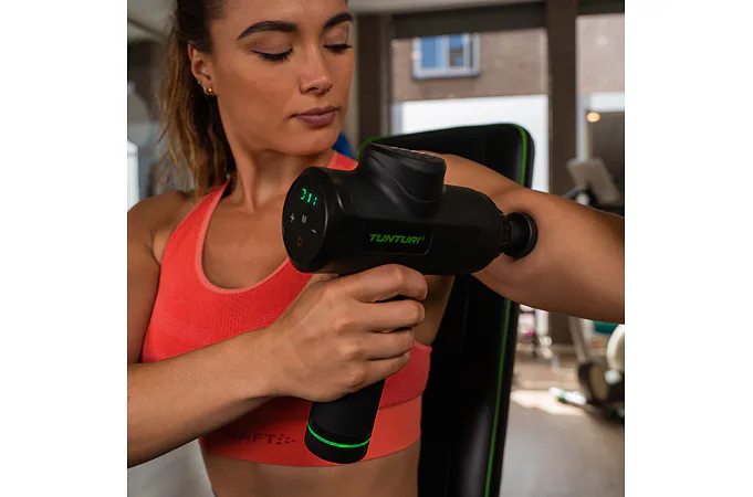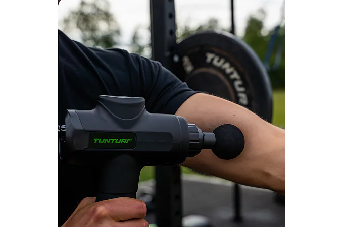 Ručný masážny stroj TUNTURI Massage Gun predstavuje perfektnú pomôcku pre fyzioterapeutov, rekreačných aj profesionálnych športovcov, pretože pomáha zmierniť svalové napätie a stuhnutosť, zvyšuje rozsah pohybu a súčasne zlepšuje cirkuláciu a prietok krvi. Použitie masážnej pištole je veľmi jednoduché a vhodné ako pred športovým výkonom ako metóda pretiahnutia, tak aj po ňom, pretože regeneruje svaly, zmierňuje kŕče vzniknuté intenzívnou fyzickou aktivitou, znižuje tvorbu kyseliny mliečnej a tiež prispieva k jej vylúčeniu. Ručný masážny stroj TUNTURI Massage Gun môžete využívať aj v prípade zranenia – urýchľuje proces rehabilitácie.