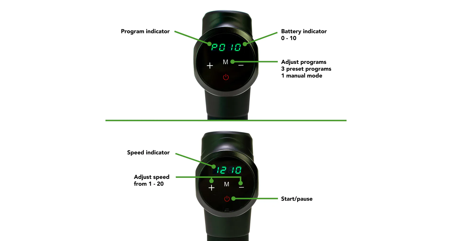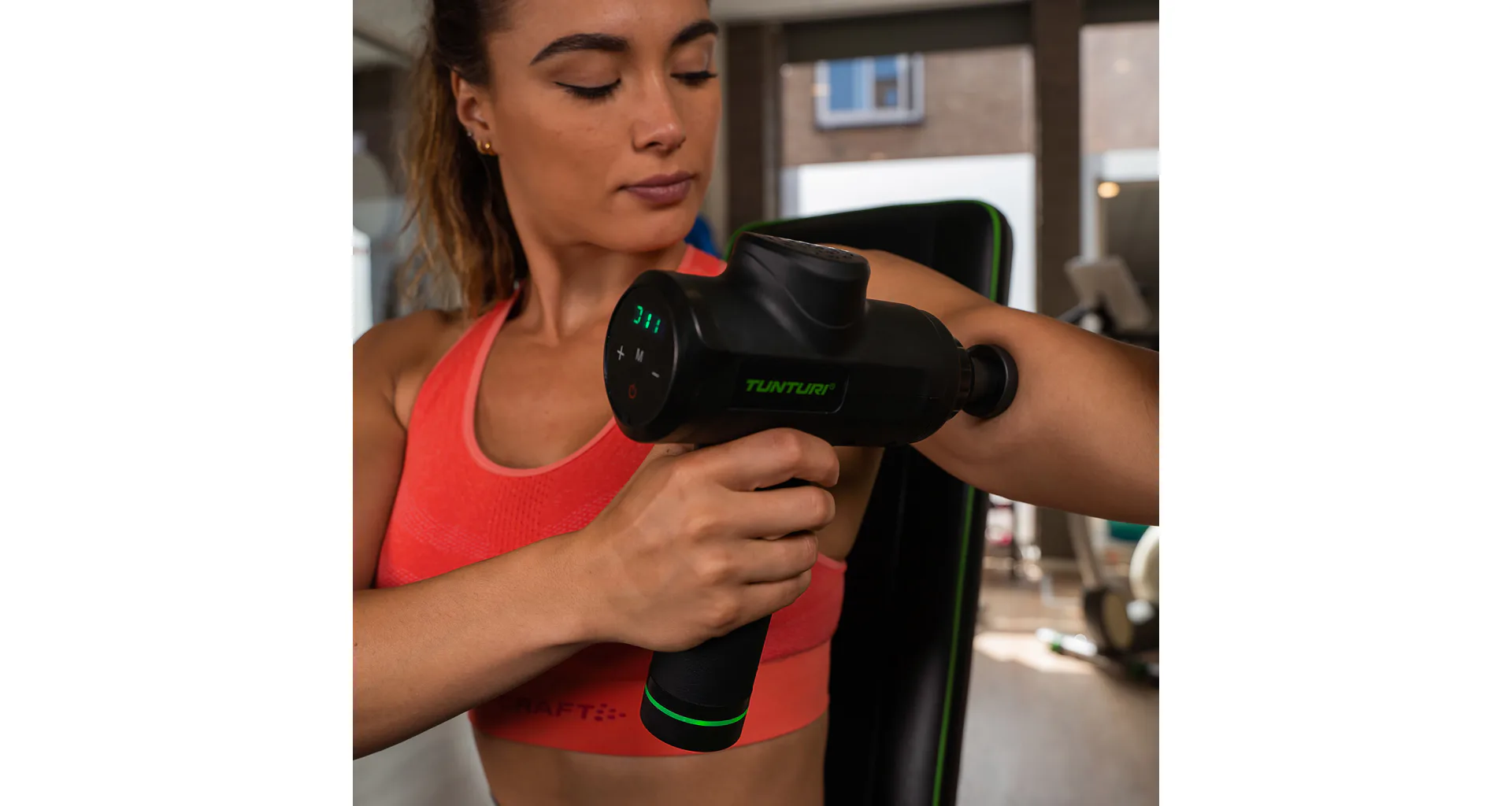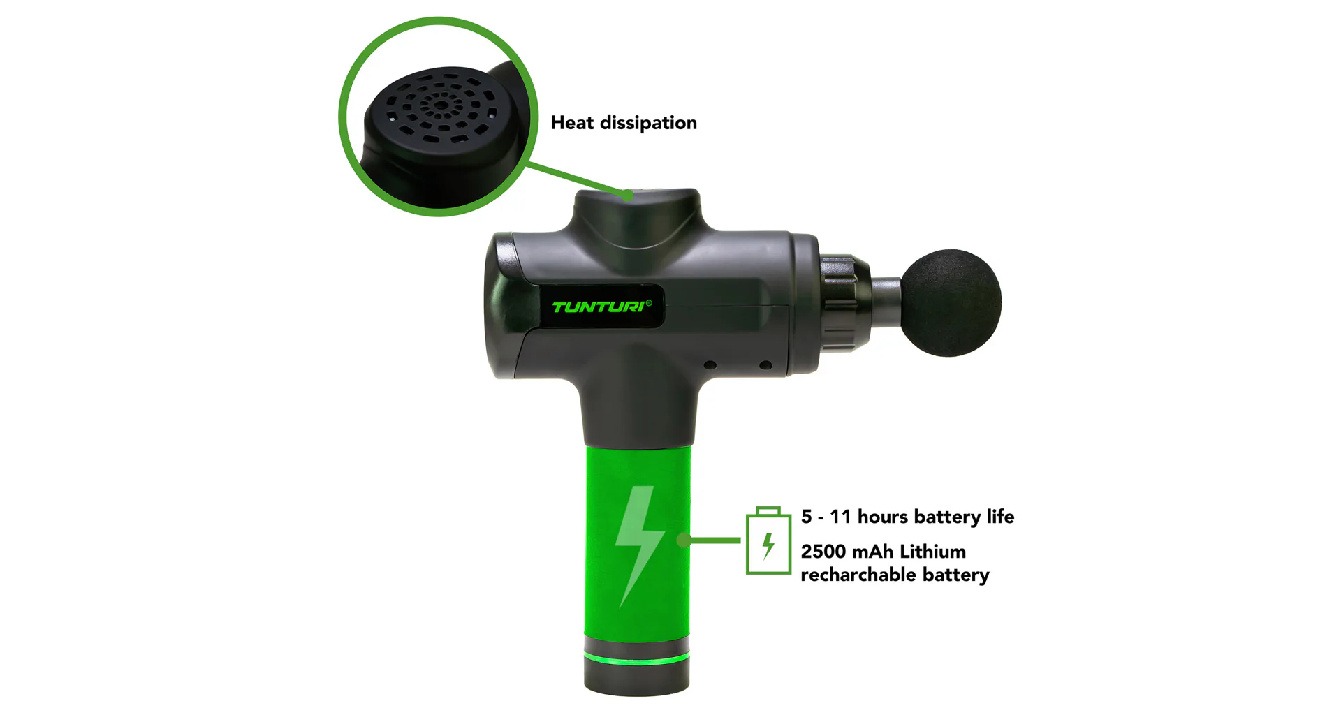 Ručný masážny stroj TUNTURI Massage Gun predstavuje perfektnú pomôcku pre fyzioterapeutov, rekreačných aj profesionálnych športovcov, pretože pomáha zmierniť svalové napätie a stuhnutosť, zvyšuje rozsah pohybu a súčasne zlepšuje cirkuláciu a prietok krvi. Použitie masážnej pištole je veľmi jednoduché a vhodné ako pred športovým výkonom ako metóda pretiahnutia, tak aj po ňom, pretože regeneruje svaly, zmierňuje kŕče vzniknuté intenzívnou fyzickou aktivitou, znižuje tvorbu kyseliny mliečnej a tiež prispieva k jej vylúčeniu. Ručný masážny stroj TUNTURI Massage Gun môžete využívať aj v prípade zranenia – urýchľuje proces rehabilitácie.