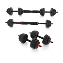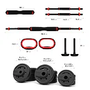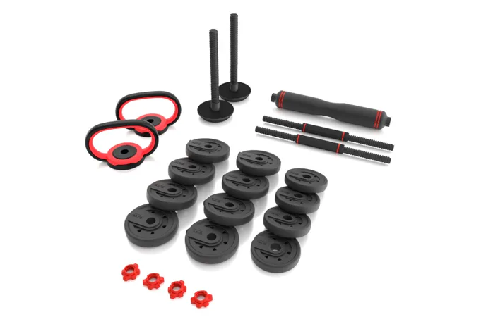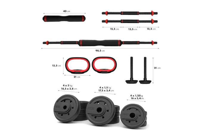 HMS SGX120 Pro je inovatívne riešenie 6v1 pre každú domácu posilňovňu. Základný stavebný prvok tvoria 2 nakladacie jednoručné činky a sada kotúčov. Vďaka širokej škále príslušenstva možno z týchto základných činiek zostaviť obojručnú činku, dva kettlebelly, činku s tromi držadlami, činku s bočným držadlom a stojan na kliky.