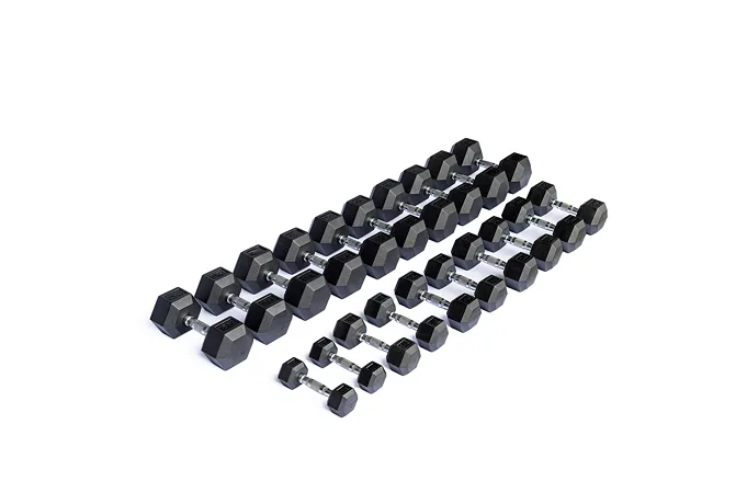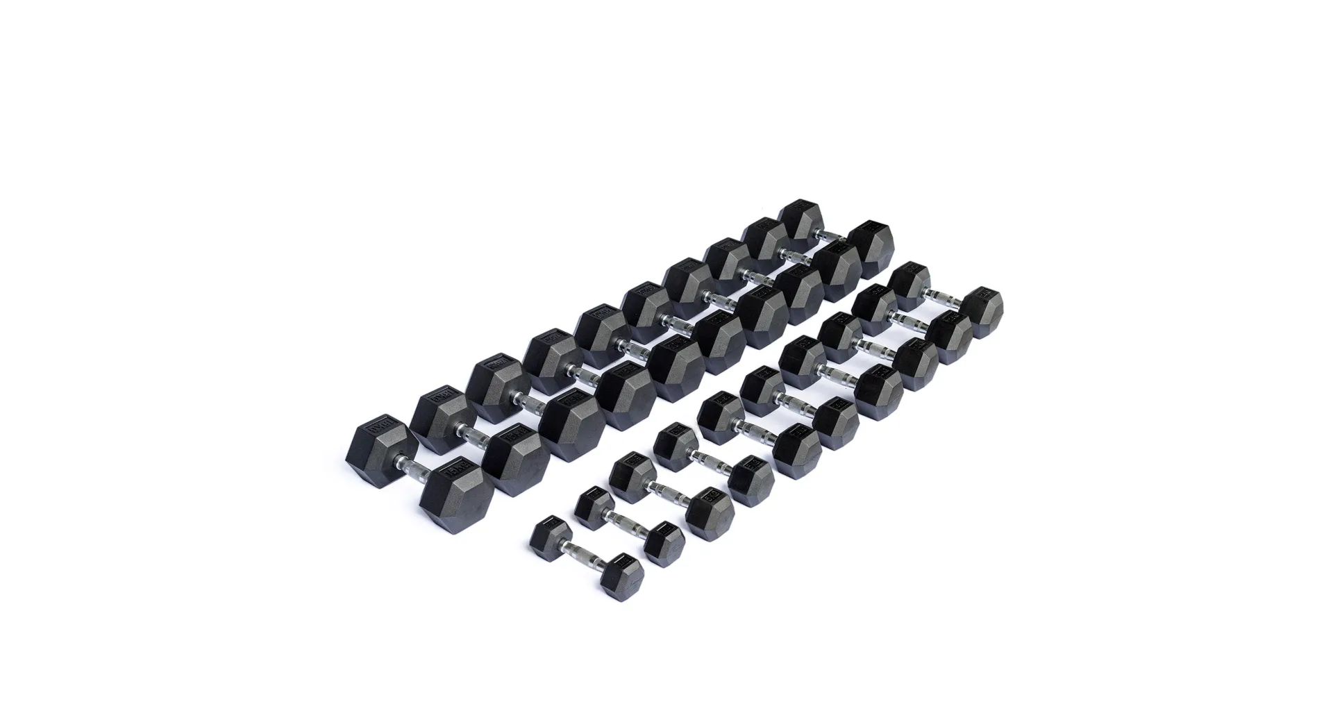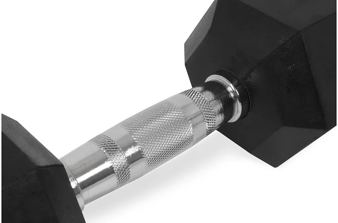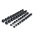 Profesionálna sada pogumovaných jednoručných činiek sa skladá z 10 párov činiek v rozmedzí 2,5 až 25 kg po 2,5 kg. Činky majú pevnú konštrukciu a odolnú gumovú povrchovú úpravu. Ergonomicky tvarovaný chrómovaný úchop umožňuje pevné úchopenie a pohodlné, bezpečné cvičenie. Pevné závažia majú v reze praktický tvar šesť-úhoľníka, aby nedochádzalo k samovoľnému pohybu činky po odložení.