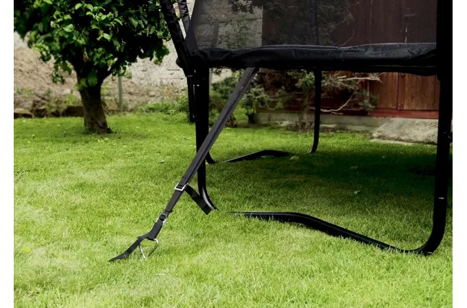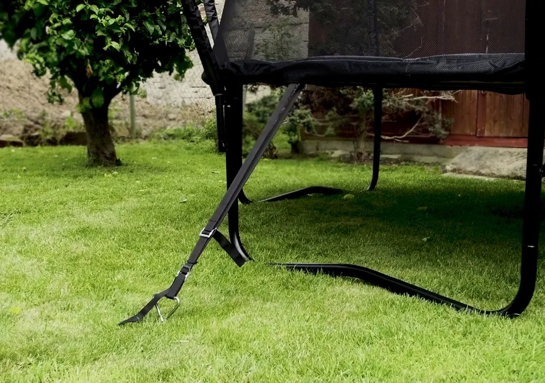Pri silnom až extrémnom vetre alebo pri náhlych nárazoch vetra nemusí byť ukotvenie účinné. Pri očakávaní silného vetra odporúčame z trampolíny demontovať ochrannú sieť a trampolínu dodatočne zaistiť (napr. betónové bloky na nohy a pod.)