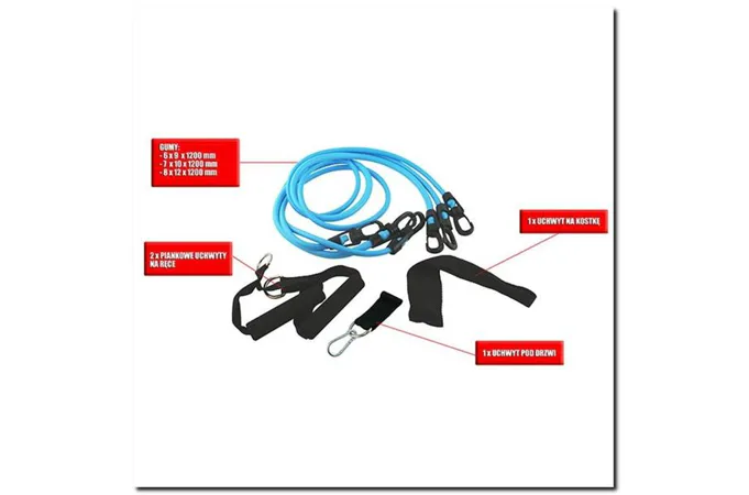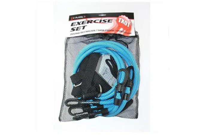 Súprava posilňovacích gúm TX01 HMS sa skladá z 3 odporových gúm a rukovätí + úchytu na členok. Vďaka úchytu do dverí môžete cvičiť v každom priestore. Každá guma má inú tuhosť, ktorá vám umožní vybrať rôzne úrovne intenzity cvičenia. Na každej z gúm môže byť rukoväť, čo umožňuje realizáciu komplexného tréningu všetkých svalových skupín.