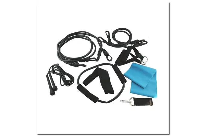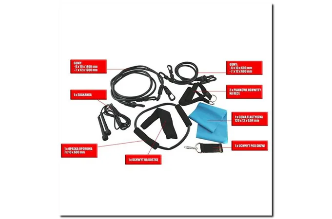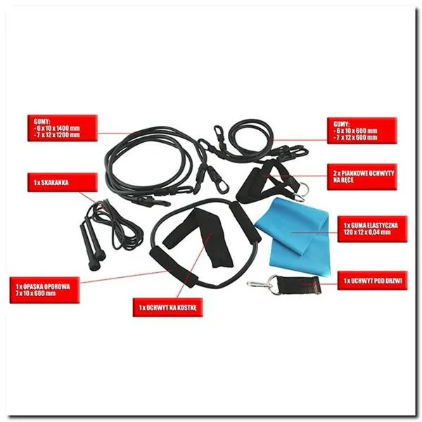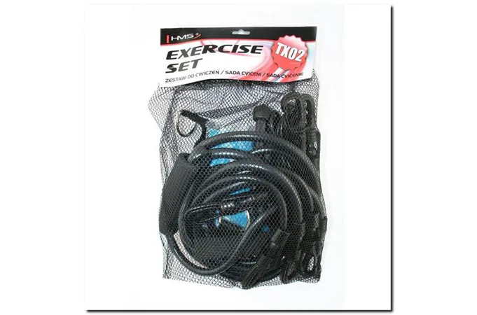 Sada posilňovacích gúm TX02 HMS sa skladá zo 4 odporových gúm, jedného elastického pásu, jedného upevovacieho pásu, dvoch rukovätí, jedného upevnenia k členku, jedného upevnenie na dvere a švihadla. Každá dvojica gúm má inú tuhosť, ktorá vám umožní vybrať rôzne úrovne intenzity cvičenia. Na každej z gúm môže byť rukovät, čo umožňuje realizáciu komplexného tréningu všetkých svalových skupín.